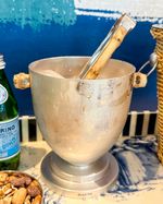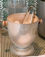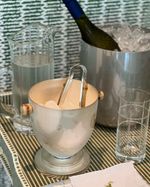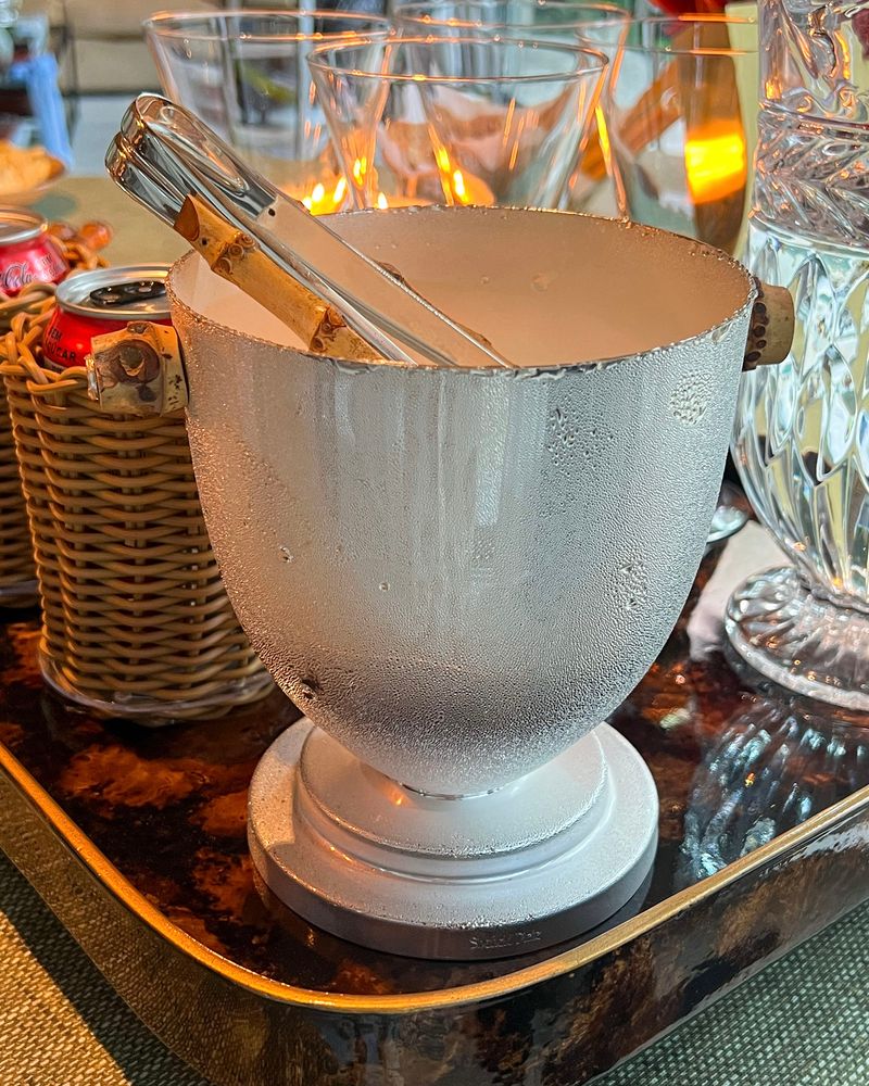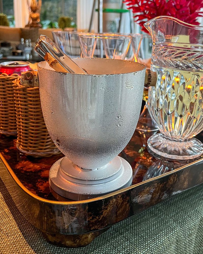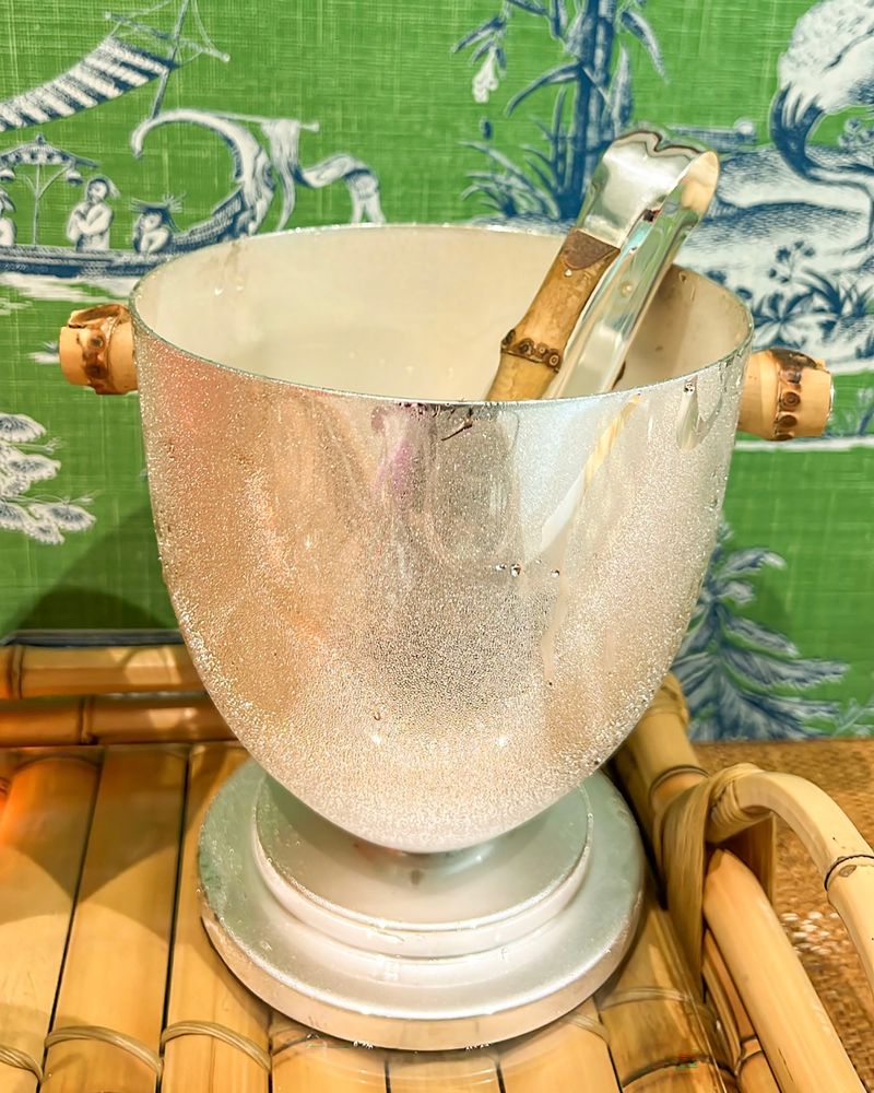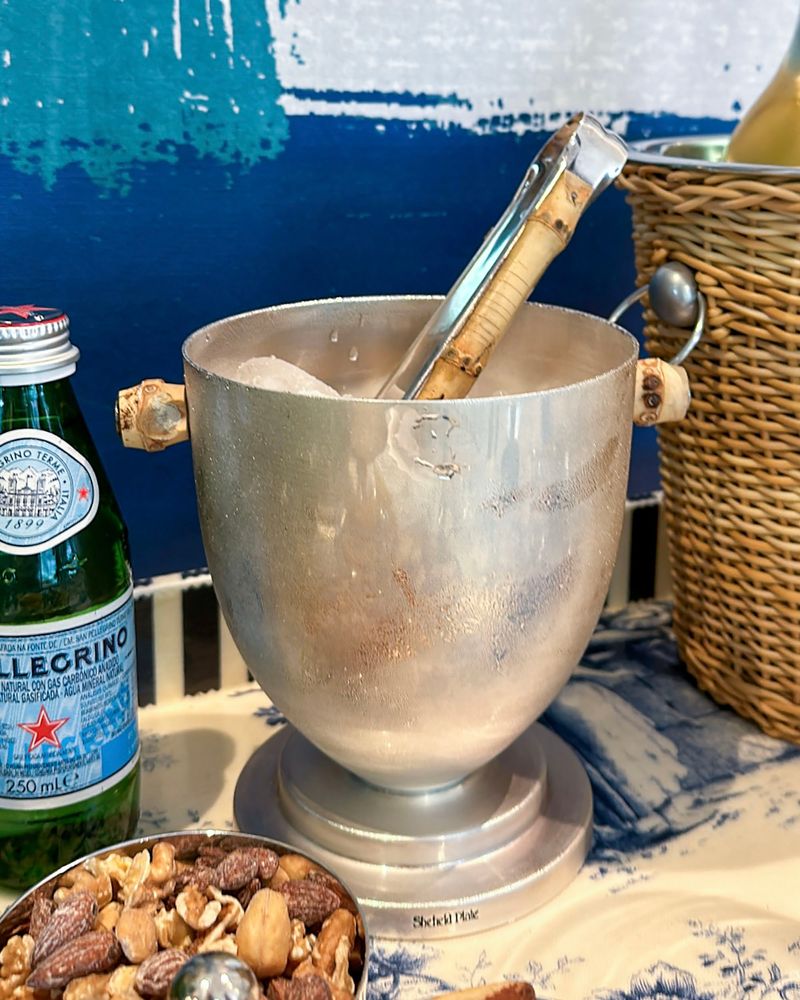 Balde de prata com alças em bambu e acompanha pegador de gelo em prata com bambu.