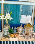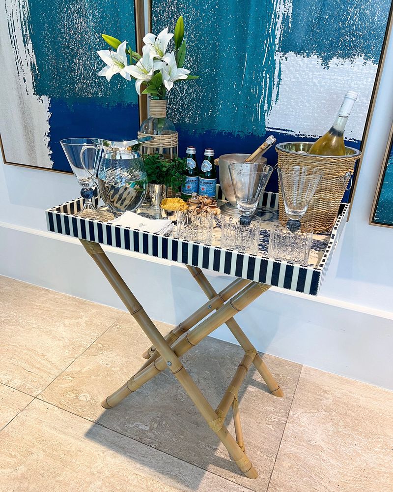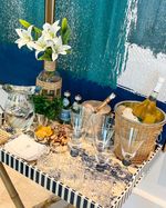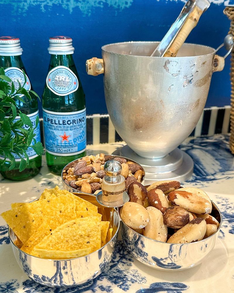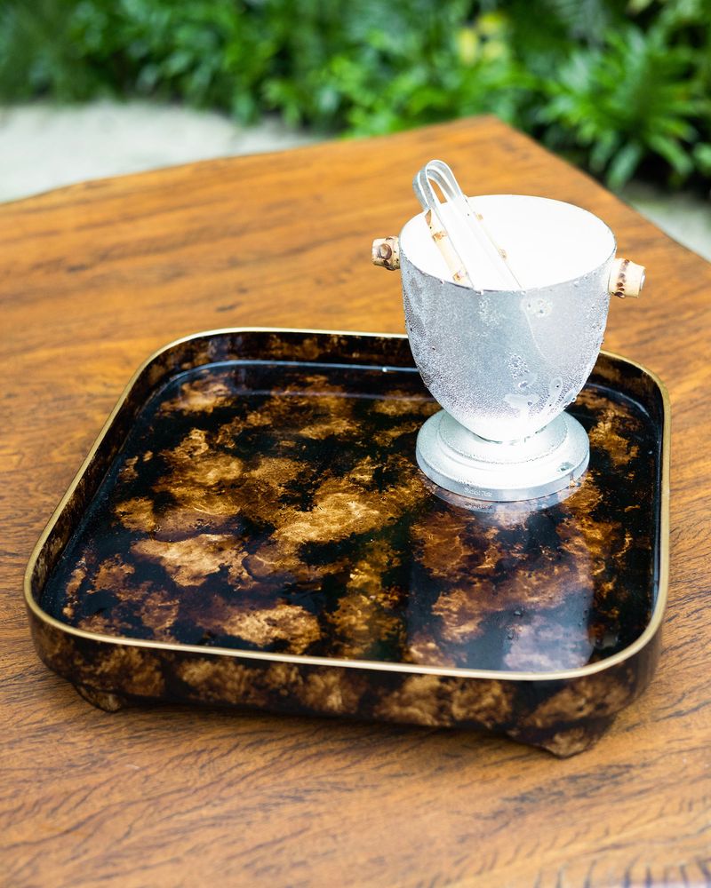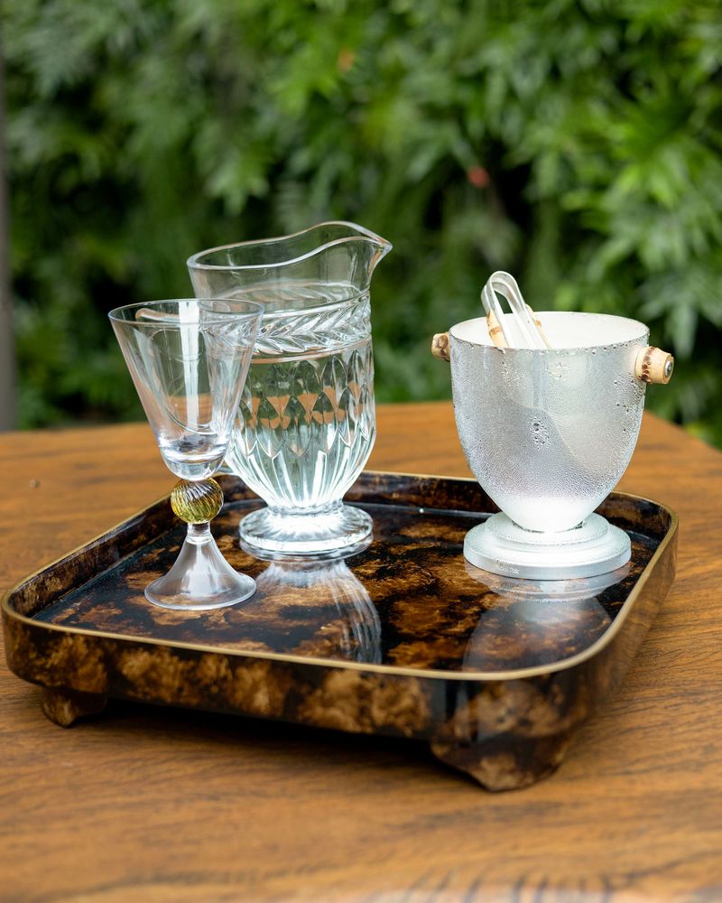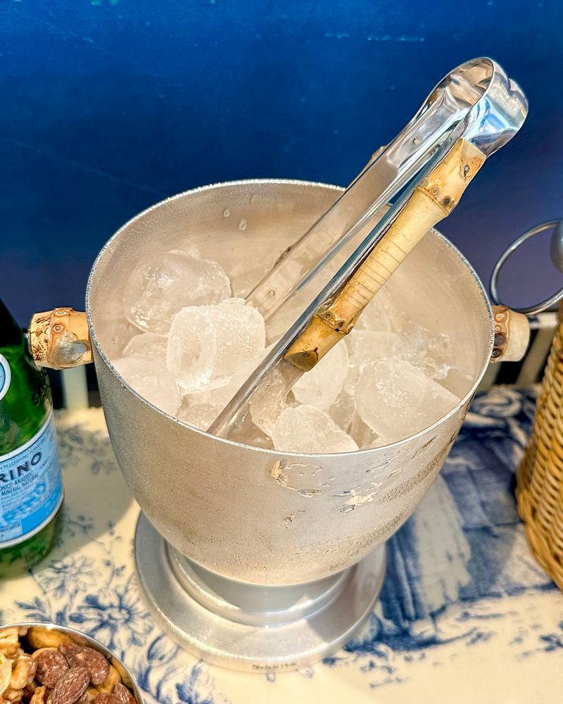 Balde de prata com alças em bambu e acompanha pegador de gelo em prata com bambu.