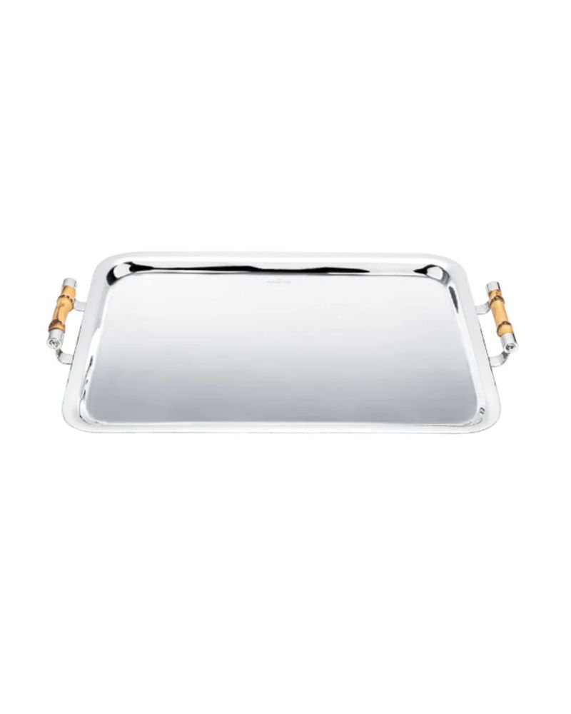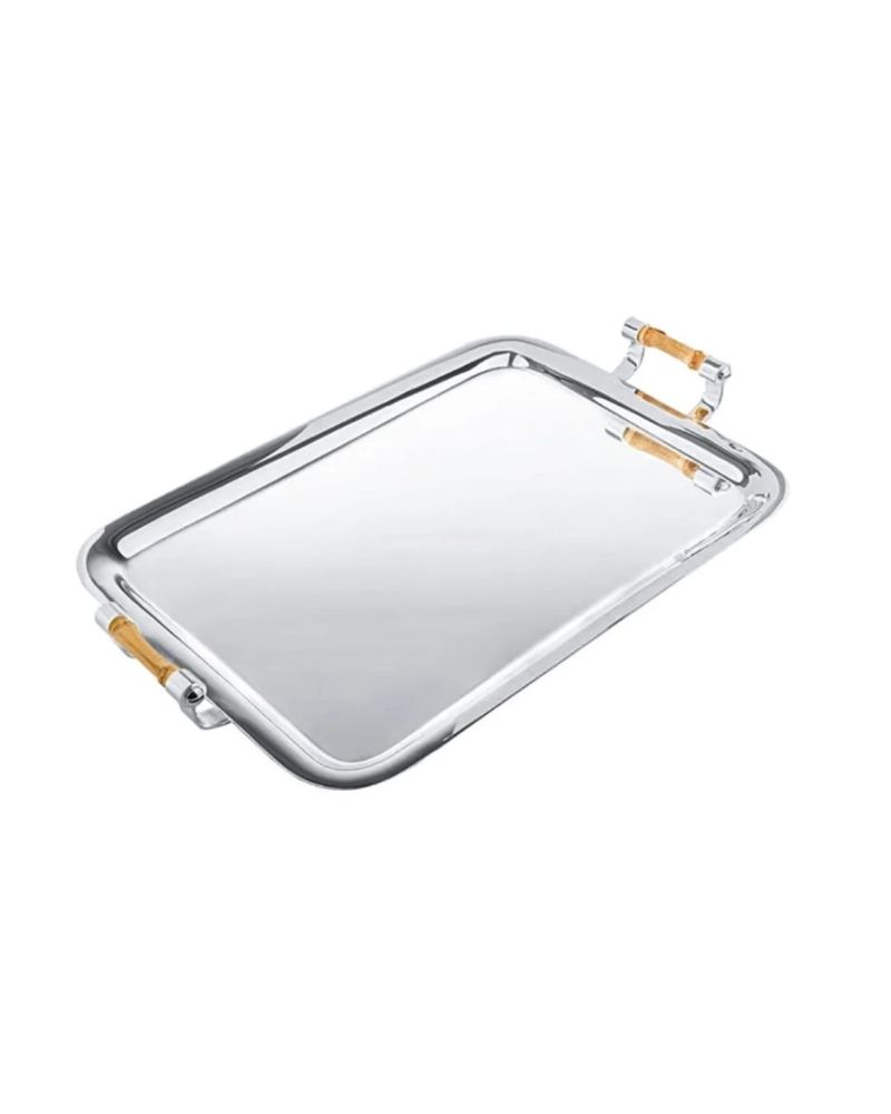 Bandeja de prata com alças detalhe de bambu medida 40x29cm.