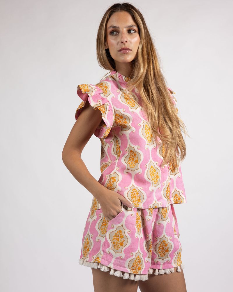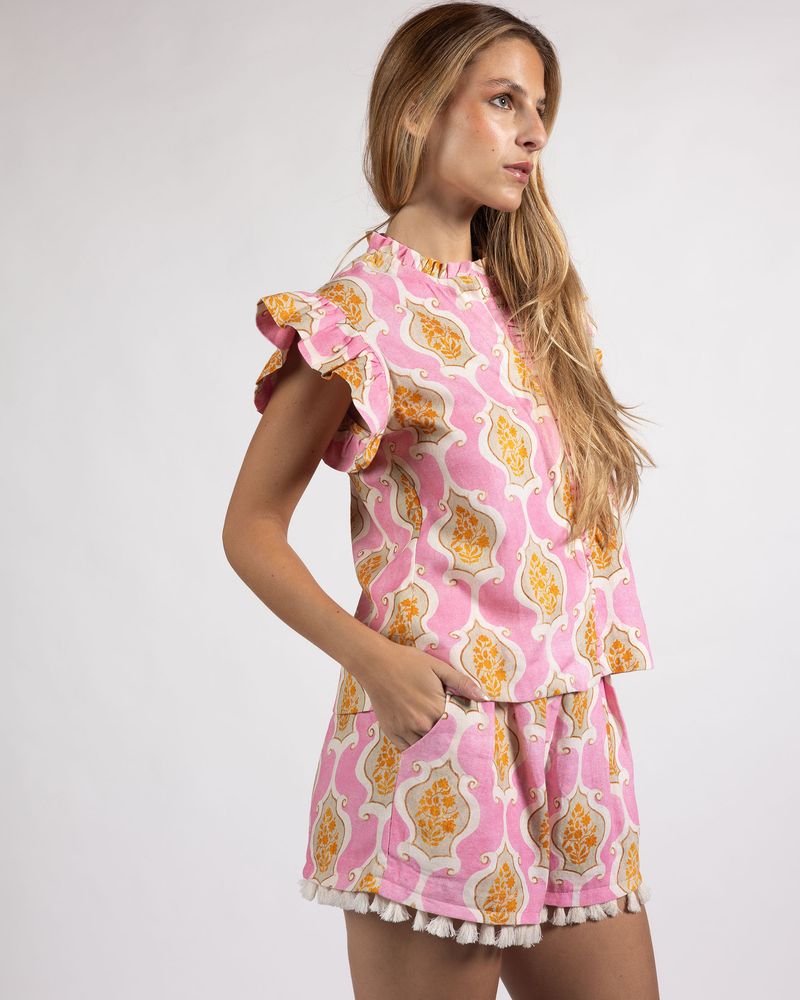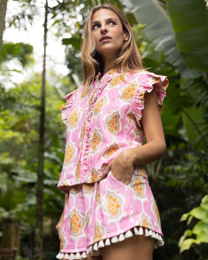 BLUSA COM ESTAMPA DE ARABESCO ROSA EM TECIDO LEVE, COM BABADOS DELICADOS NA GOLA E NAS MANGASE FECHAMENTO EM BOTÕES. ESTAMPA EXCLUSIVA E MODELAGEM CONFORTÁVEL PARA UM LOOK SOFISTICADO E FRESCO.
