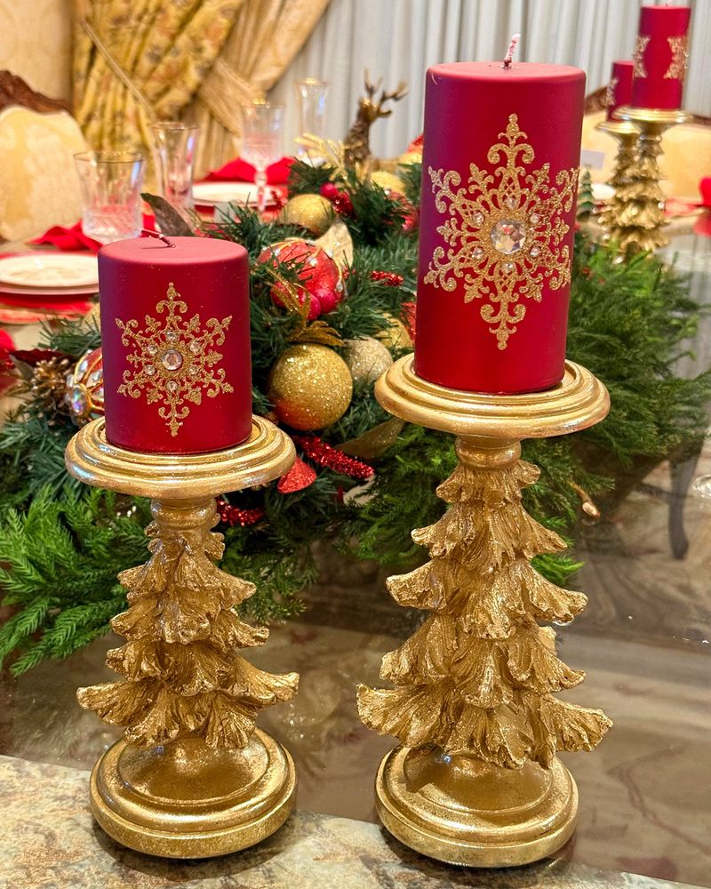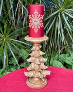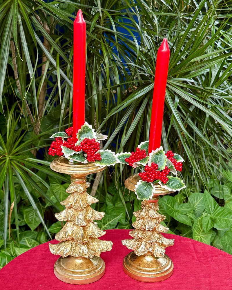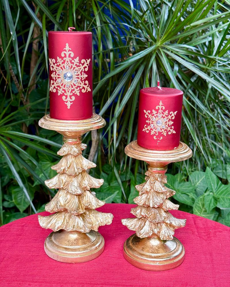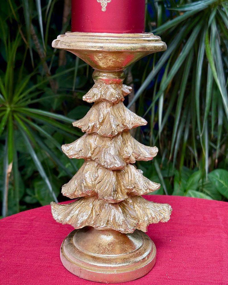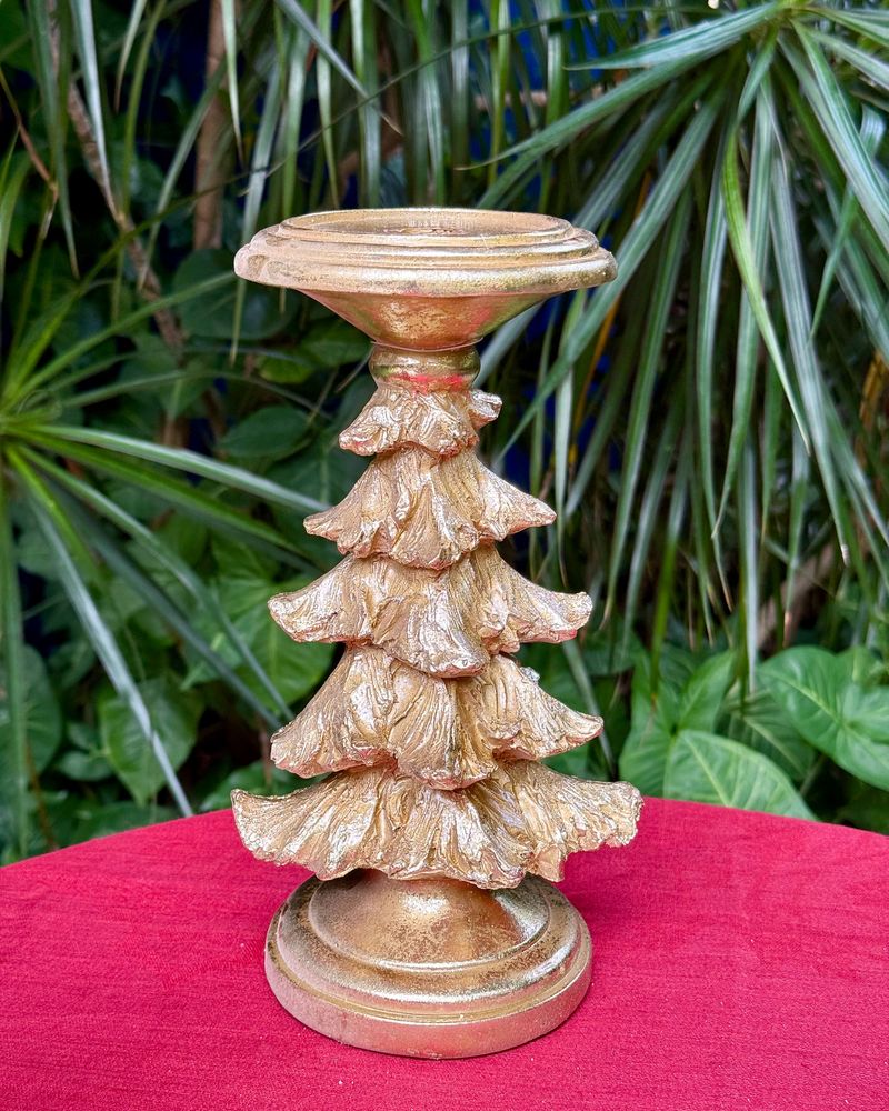 Castiçal formato árvore dourada medindo 25cm de altura x 8,5cm a base para por vela grossa e também tem a opção de por vela fina pq tem um buraco pequeno no meio.