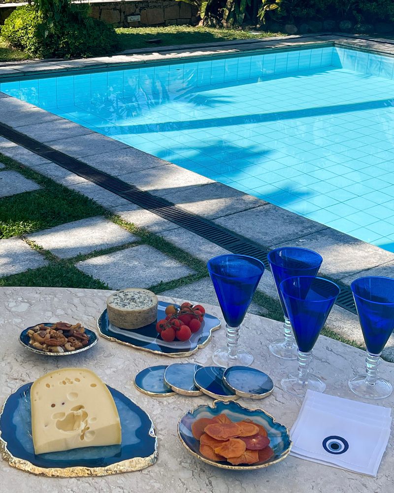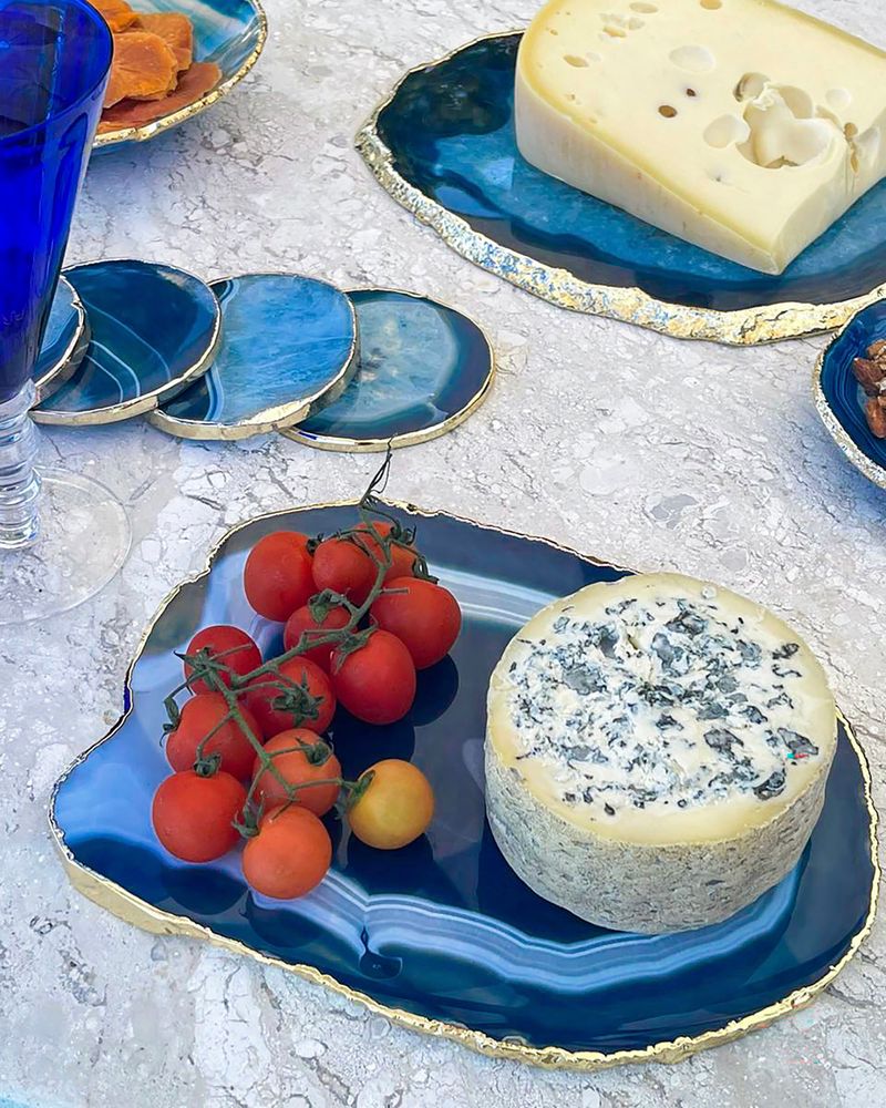 Chapa de ágata azul tamanho P com friso dourado com tamanho entre 25 a 30cm.