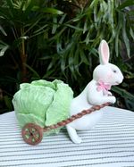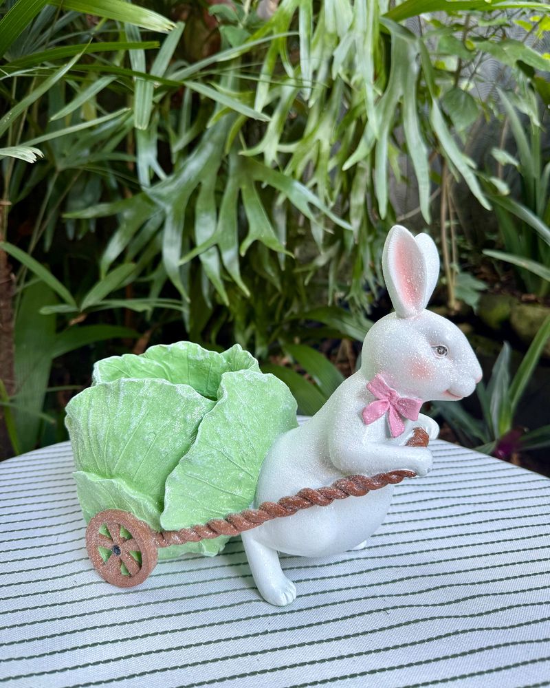 Coelho puxando cesta de alface em resina medindo 26x22cm.
