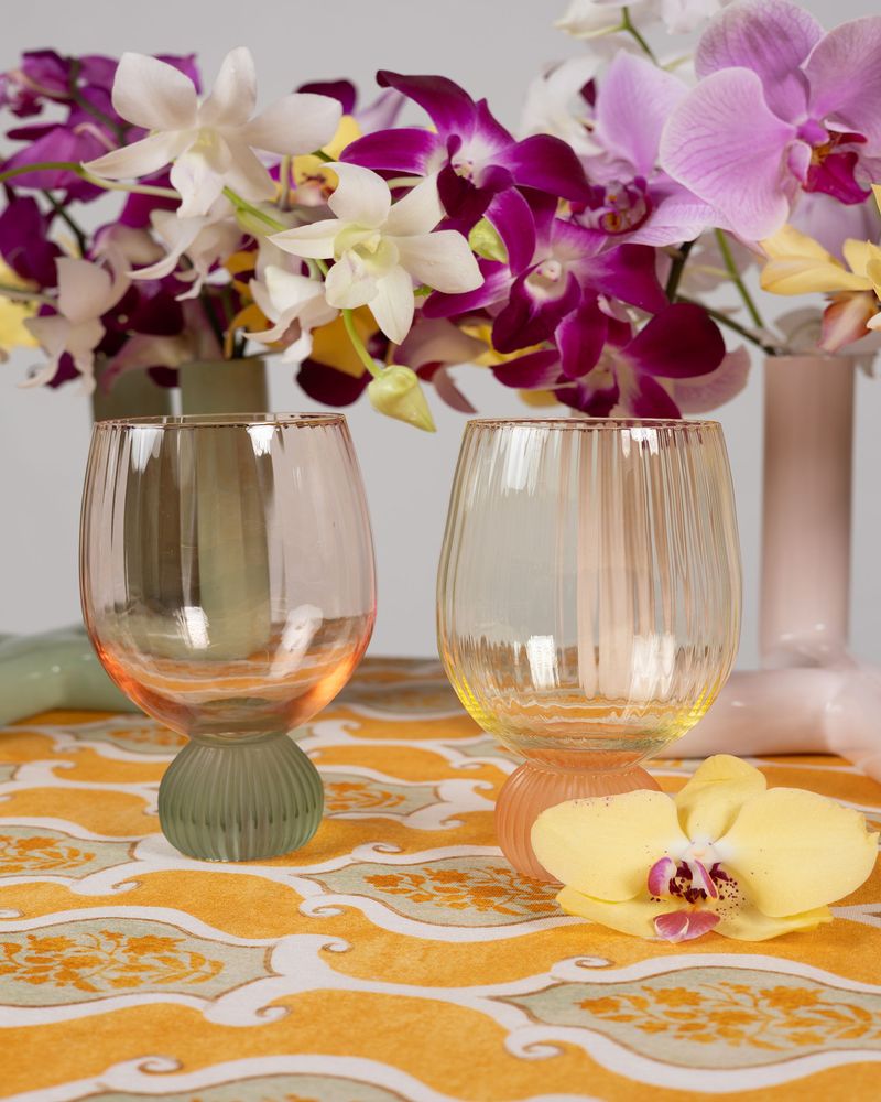 Copo em vidro bicolor amarelo e salmão medindo 17cm de altura.