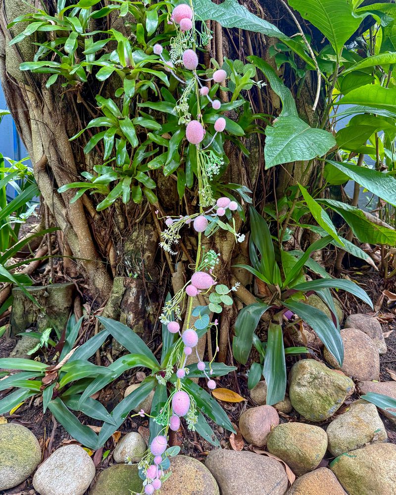Galho longo totalmente maleável com ovos rosas e folhagens verde.