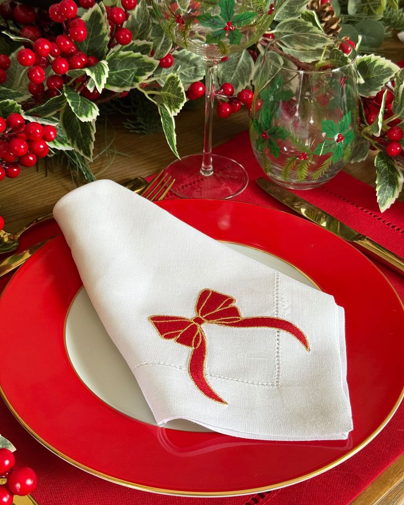 Guardanapo de linho branco laço vermelho.