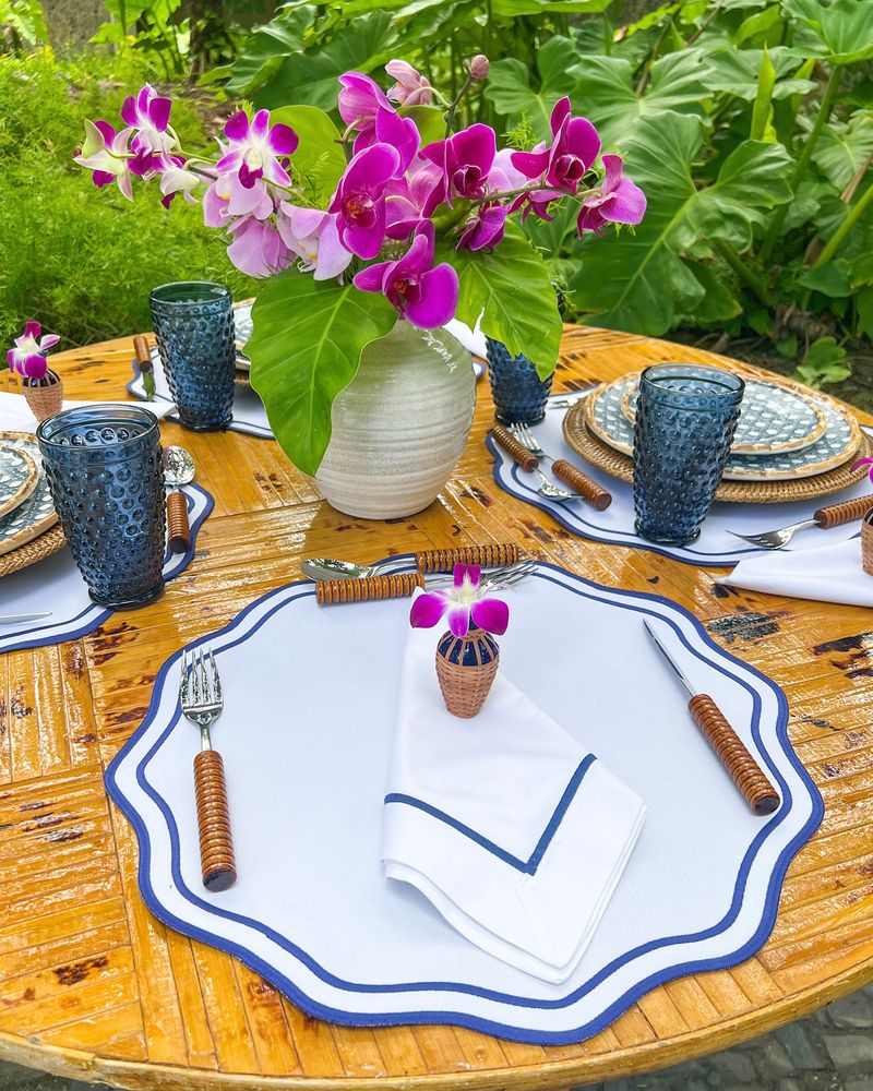 Guardanapo de algodão percal medida 50x50cm com bordado de barra palito azul marinho.