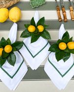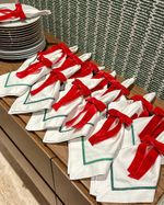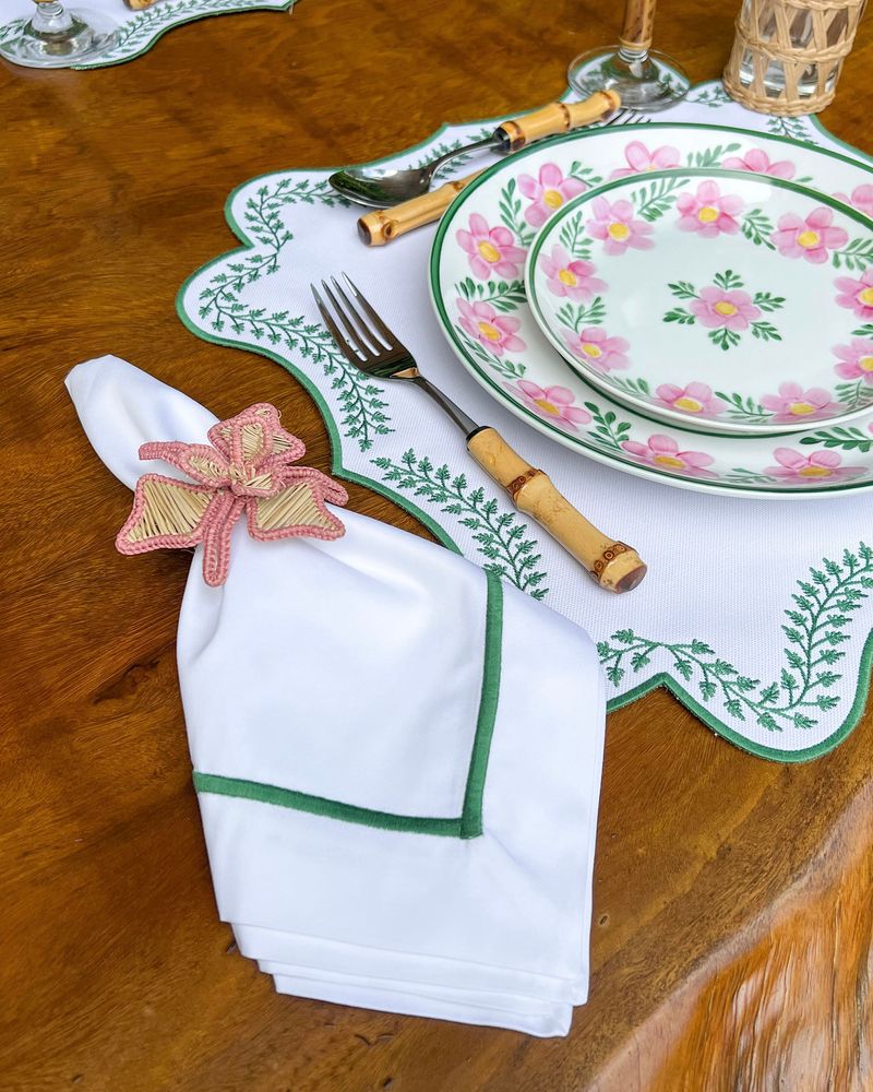 Guardanapo de algodão percal medida 50x50cm com bordado de barra palito verde escuro.