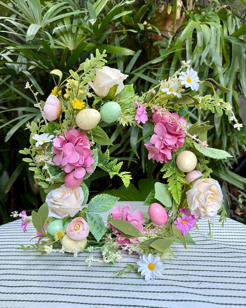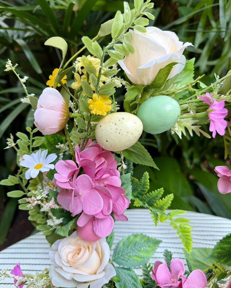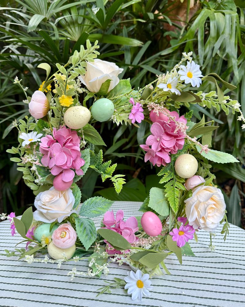 Guirlanda floral com ovos em tons rosados. e folhagens verdes.