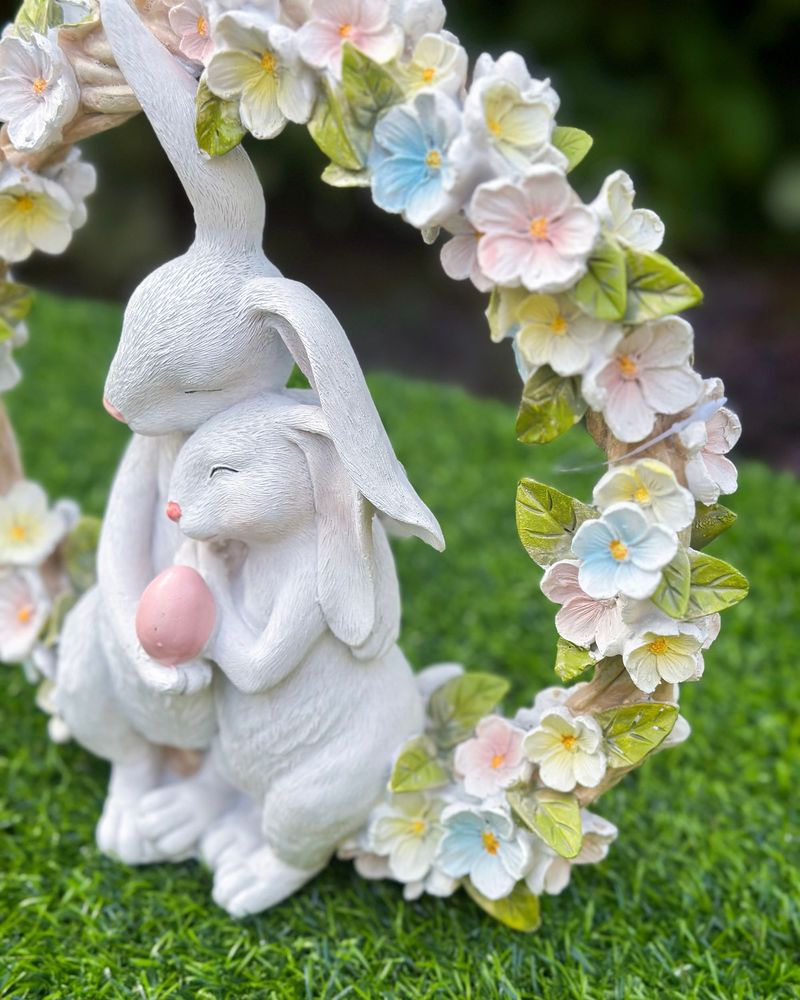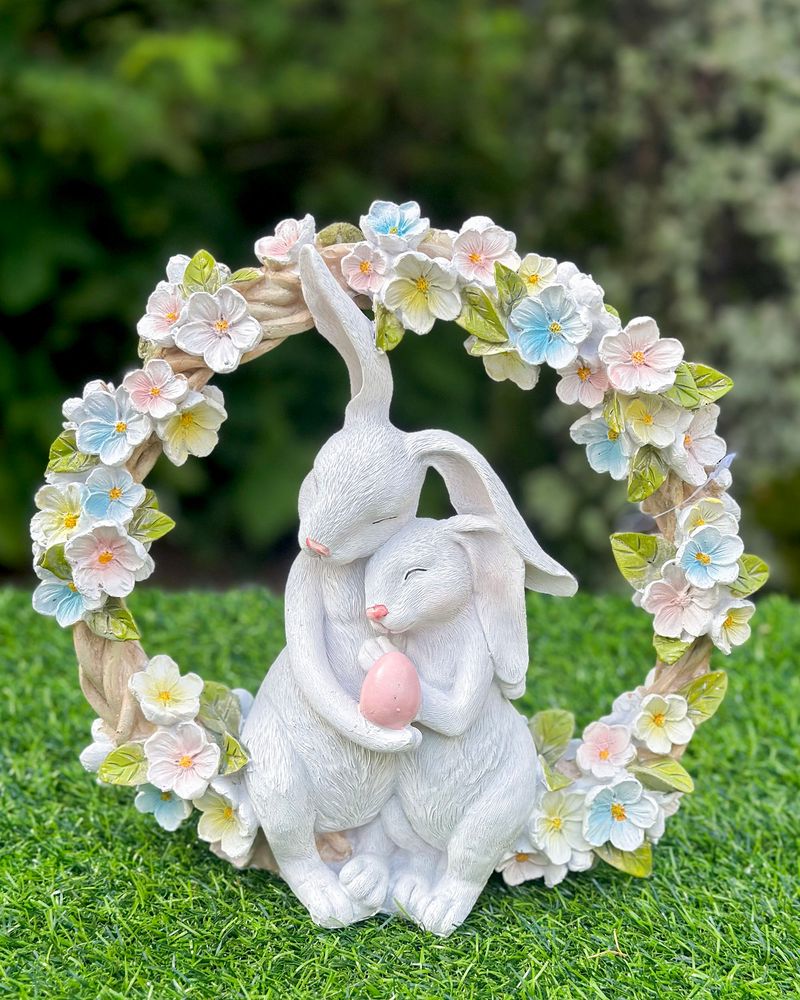 Guirlanda floral com coelhos em resina.