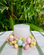 Mini guirlanda para vela com ovos em tons pasteis medindo 14cm de diâmetro.