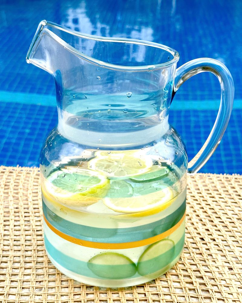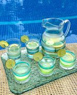 Jarra transparente em acrilico com listras azul e dourado com alça.