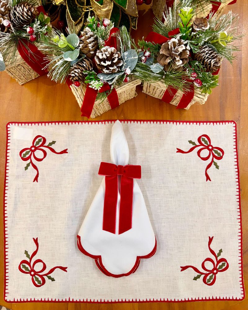 Jogo americano retangular linho bordado laço velvet - Natal 2025