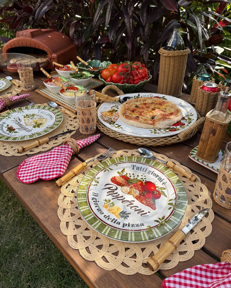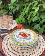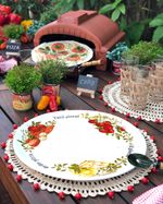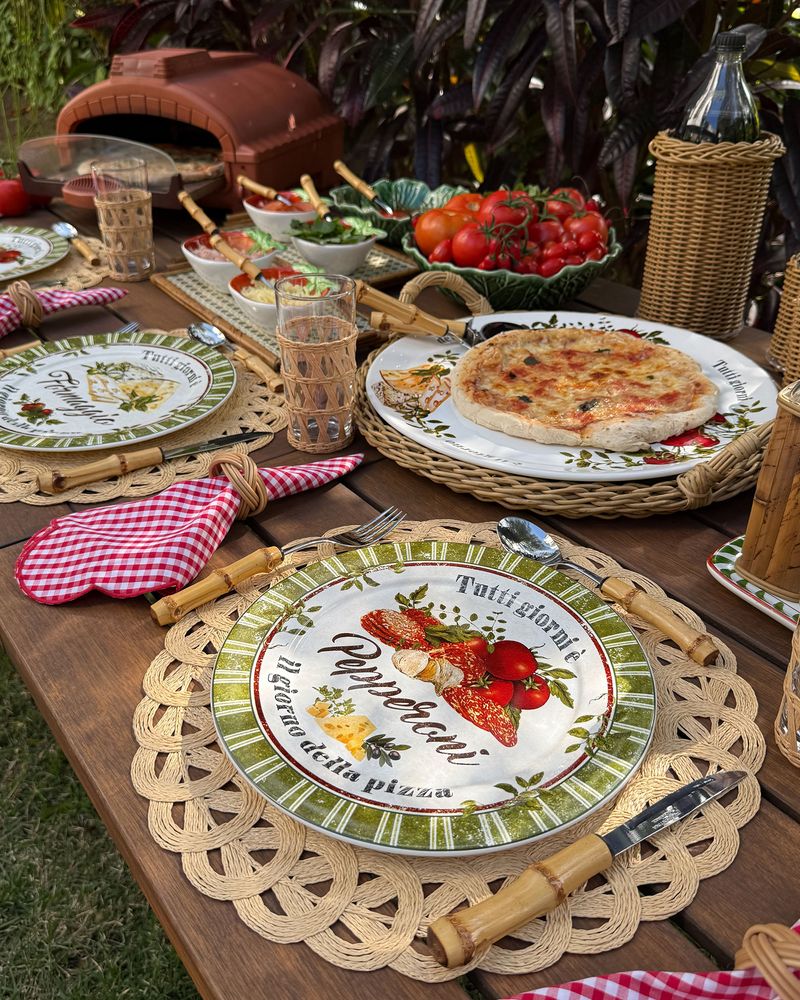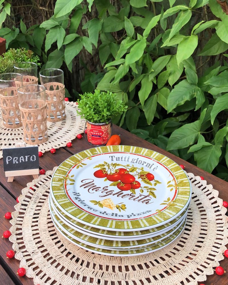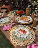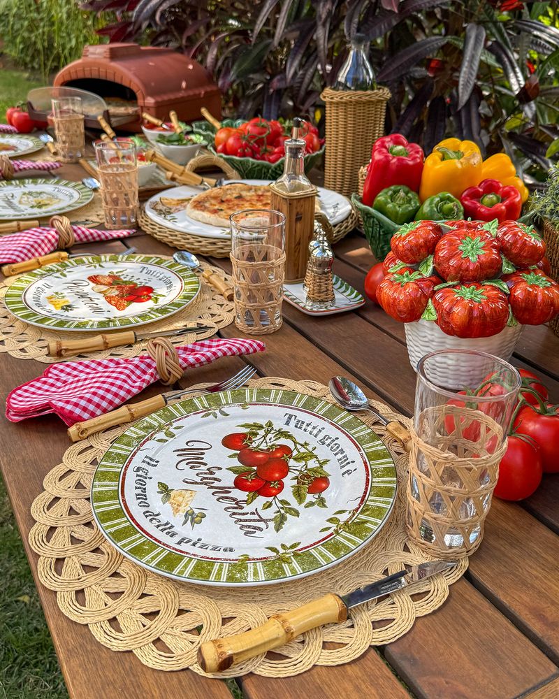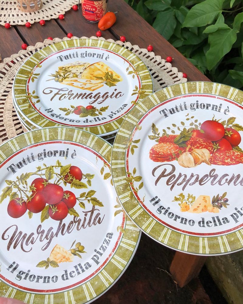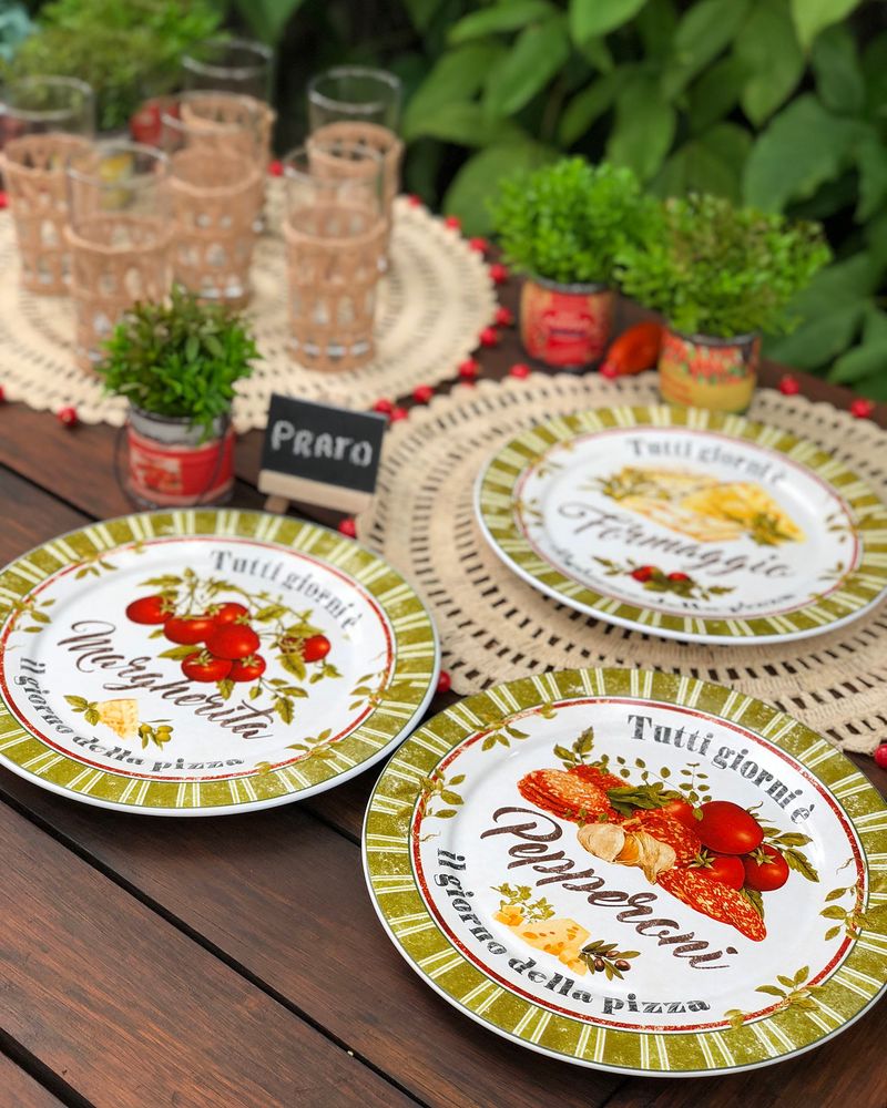 6 pratos rasos de cerâmica estampados com desenho de tomate e queijo.
