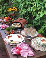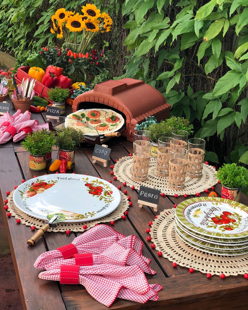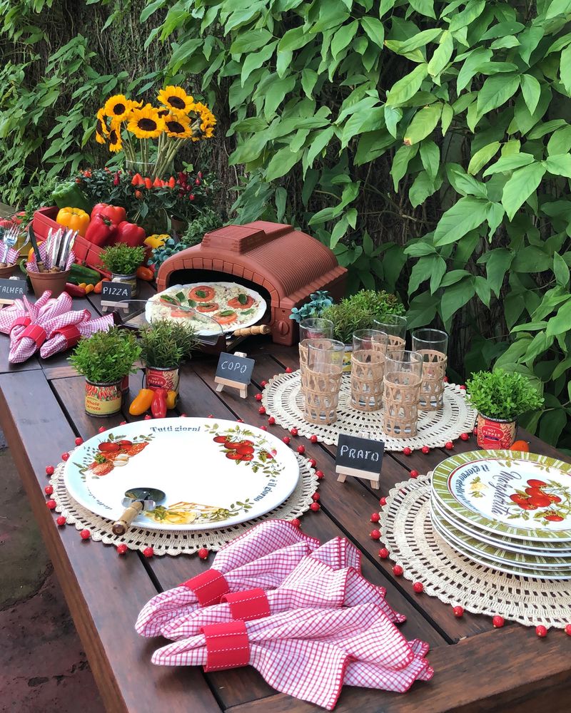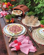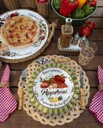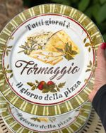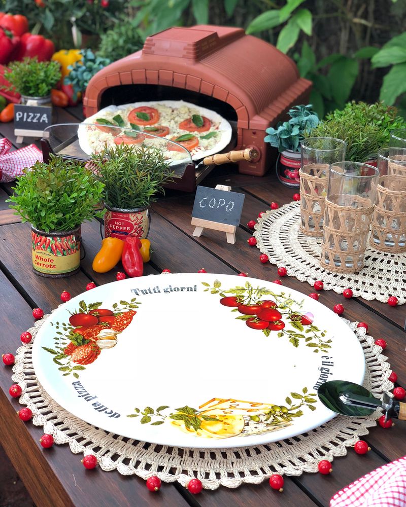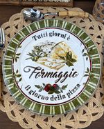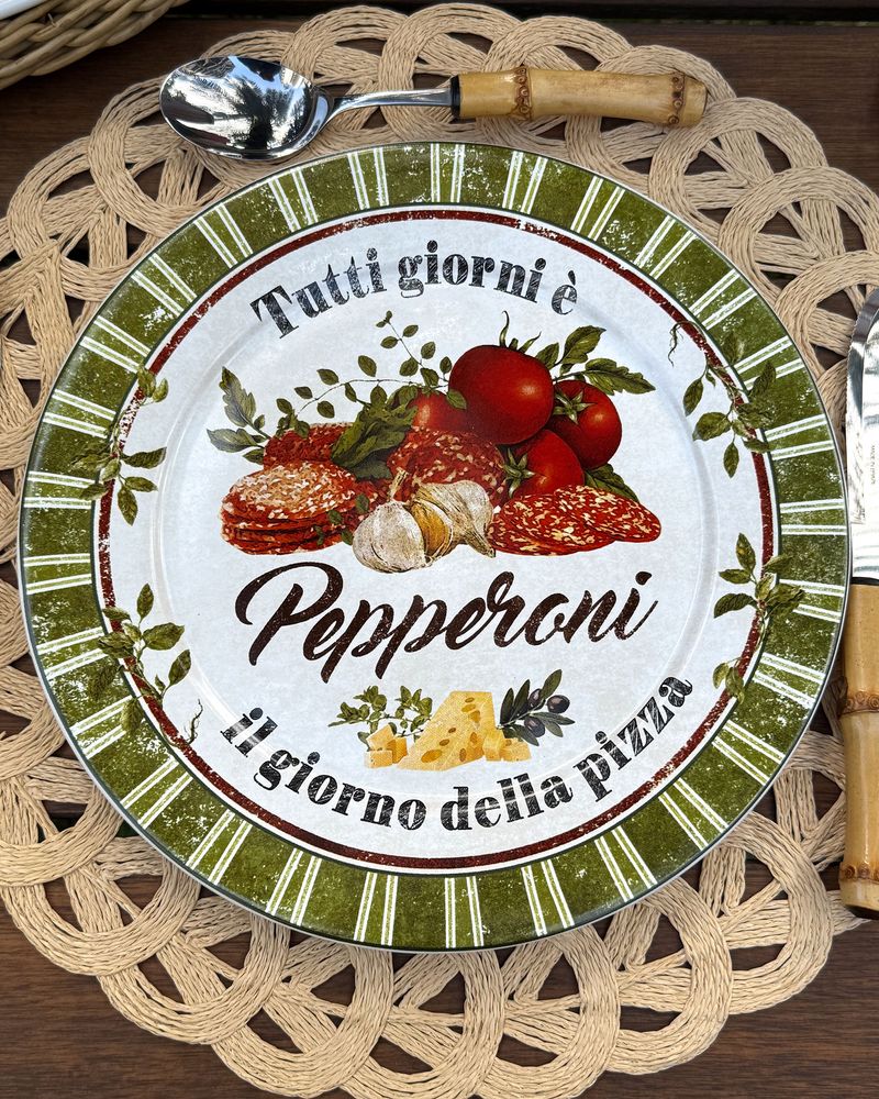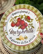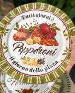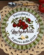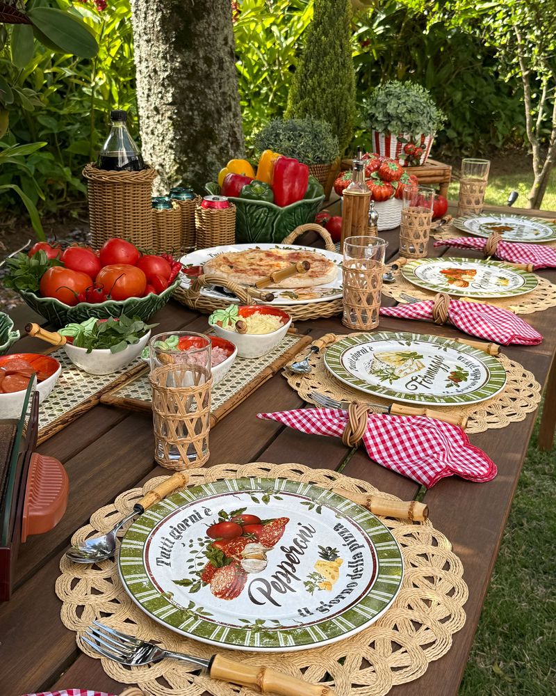 6 pratos rasos de cerâmica estampados com desenho de tomate e queijo.