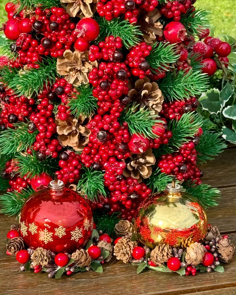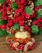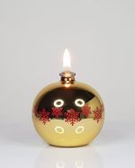 Lamparina em formato de bola com vidro grosso ultraresistente pintada cor dourado com flocos vermelhos, acompanha pavio de vidro eterno.