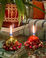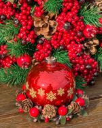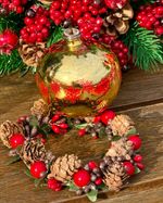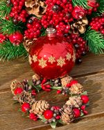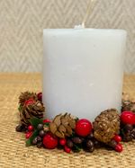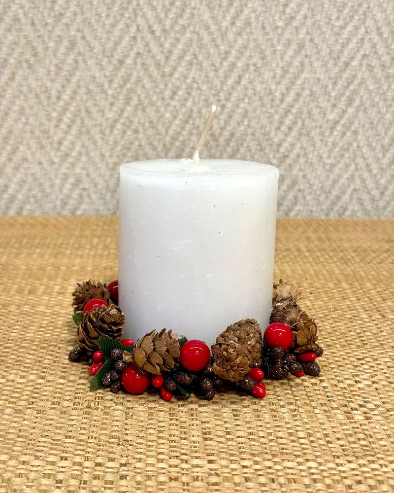 Mini guirlanda para vela com pinhas e frutinhas cristalizadas medindo 10cm de diâmetro.