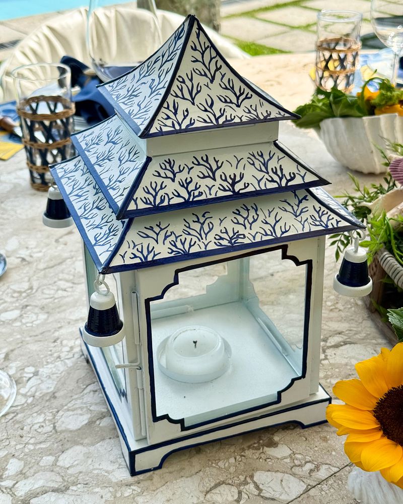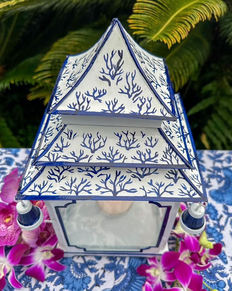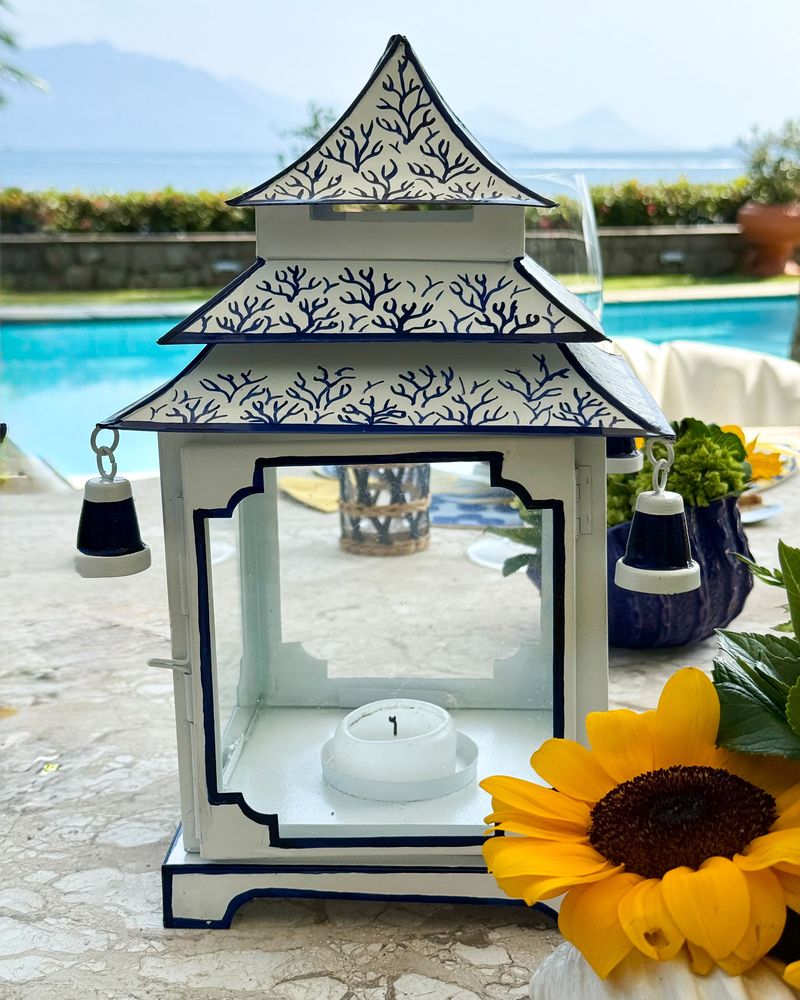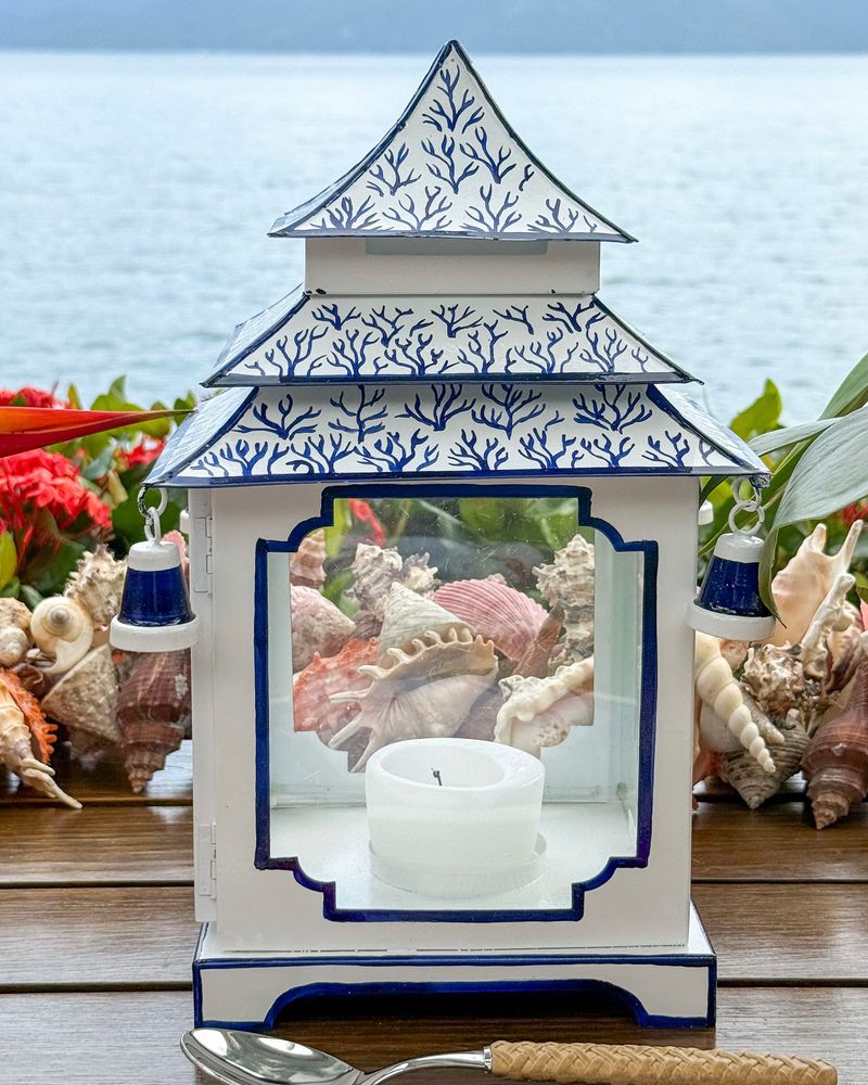 Pagoda porta vela de ferro pintada a mão raiz de coral branco e azul.