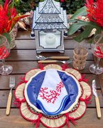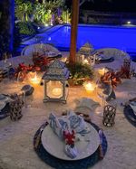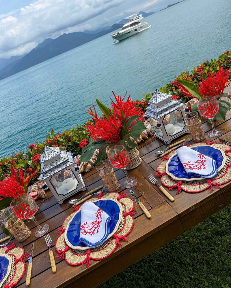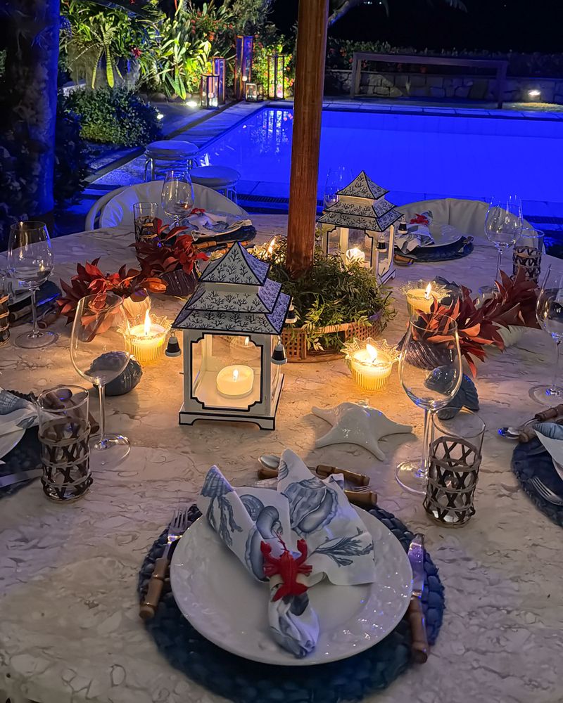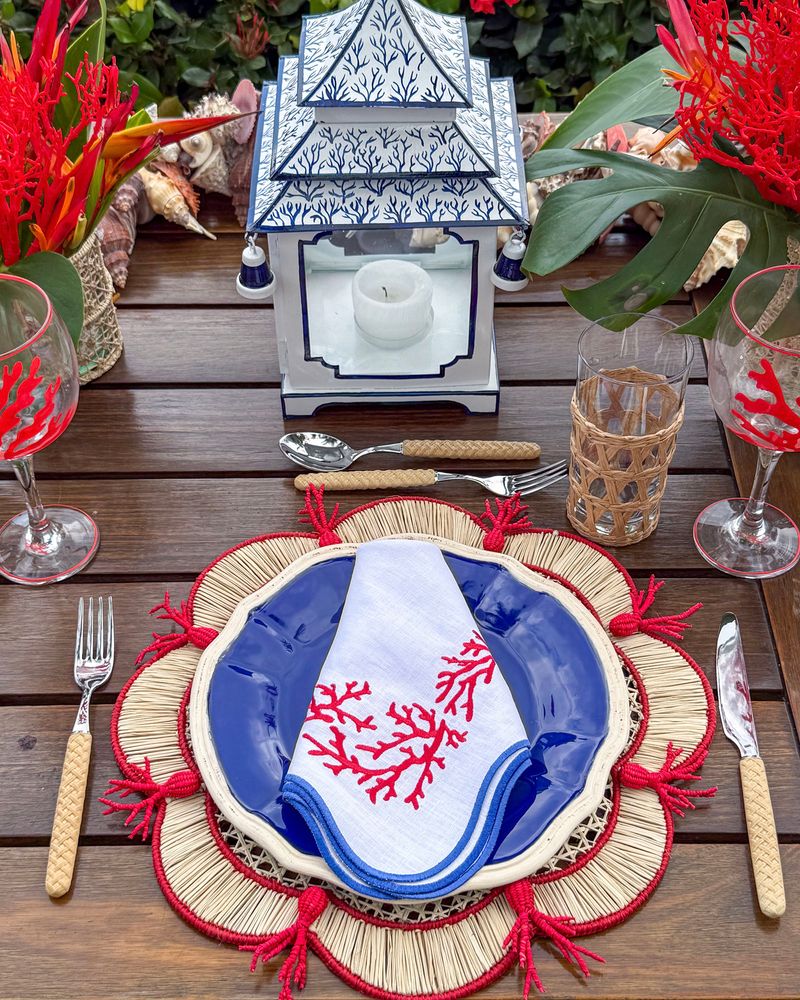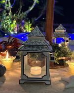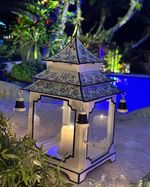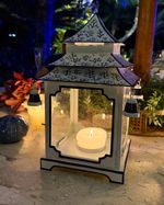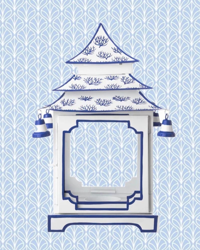 Pagoda porta vela de ferro pintada a mão raiz de coral branco e azul.