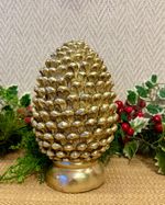 Pinha decorativa em resina dourada medindo 23cm de altura.