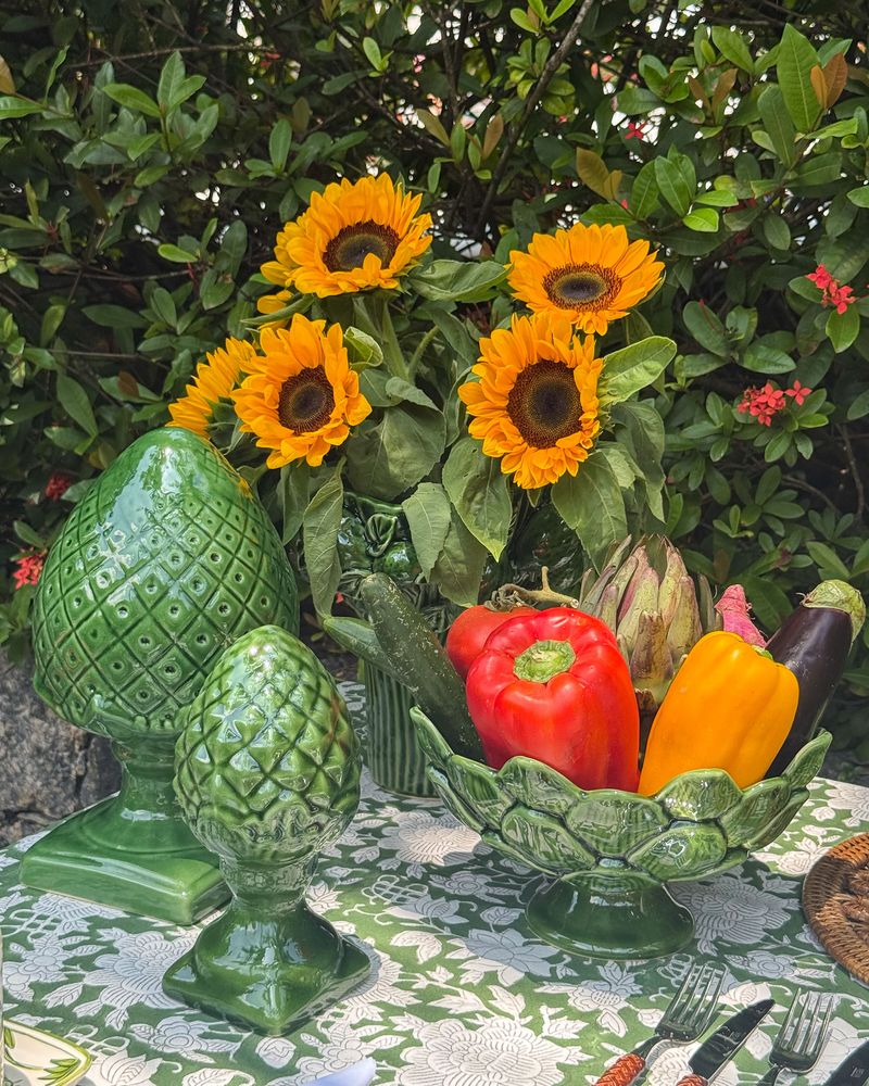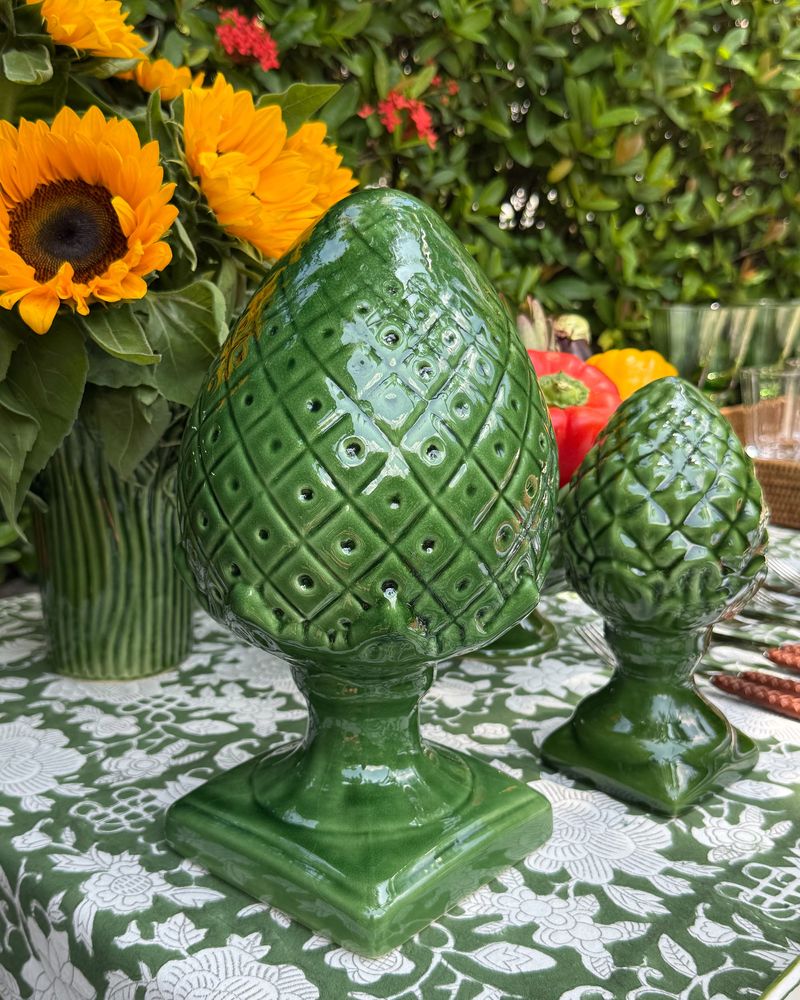 Pinha decorativa em cerâmica cor verde medindo 30cm de altura.