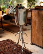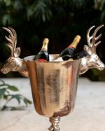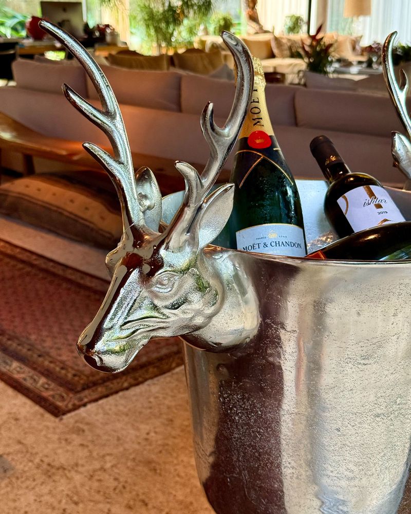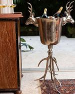 Porta garrafa champagneira cabeça de alçe nas laterais e detalhe chifre de alçe na base. O Suporte da bebida é rosqueável então dá pra usar sem o pé também.