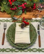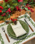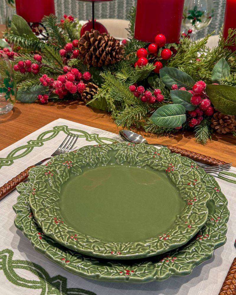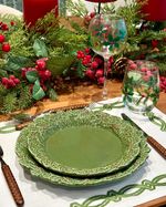 Prato raso em cerâmica na cor verde de azevinhos em relevo na borda.