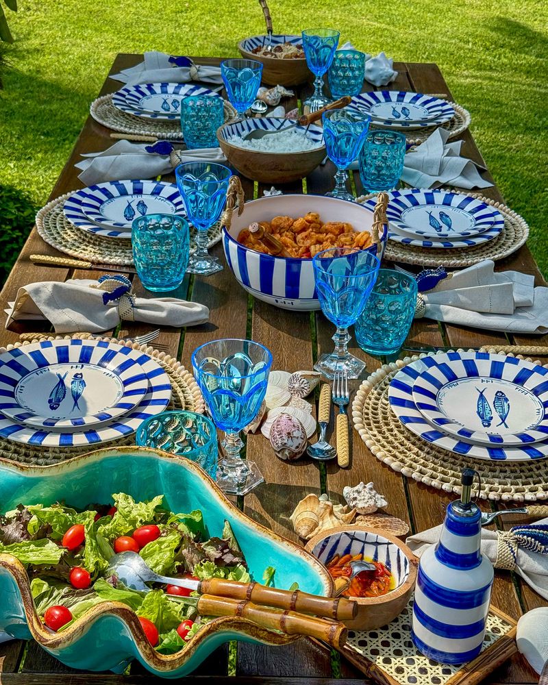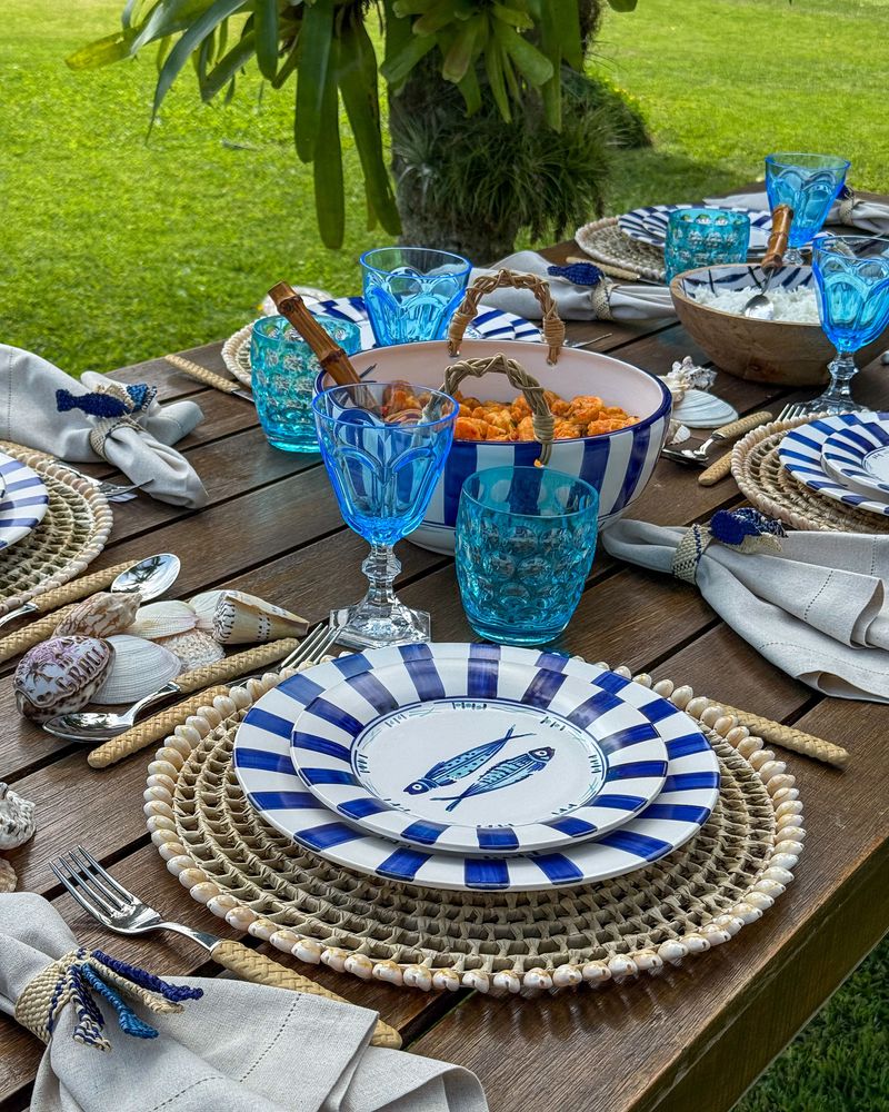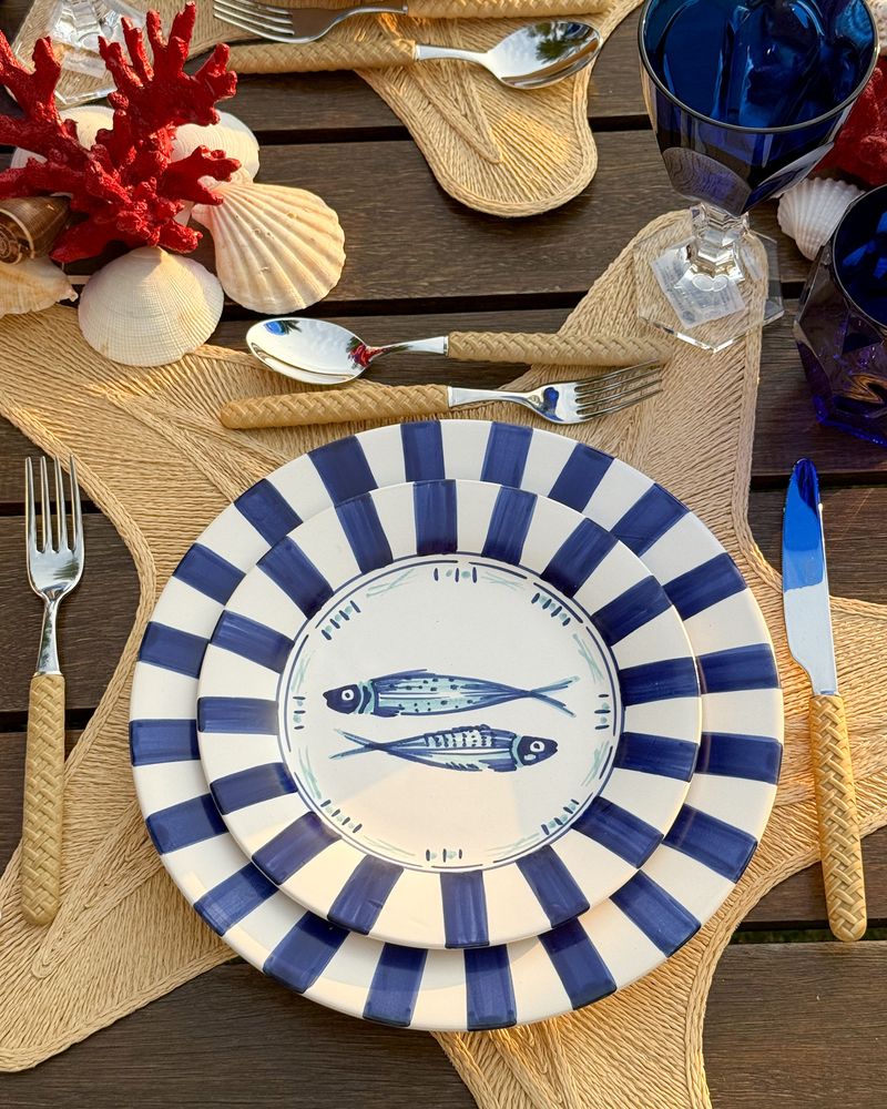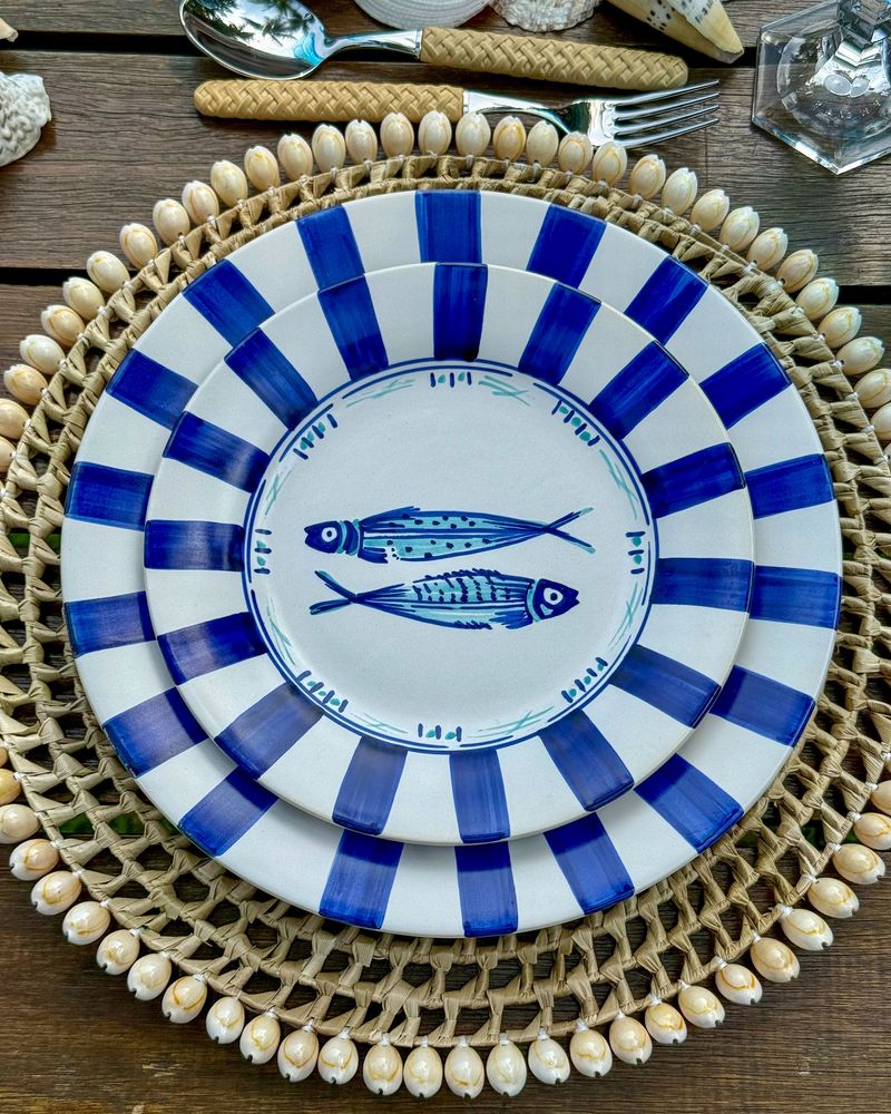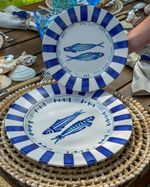 Prato de sobremesa em cerâmica listrado azul marinho com peixes no centro.
