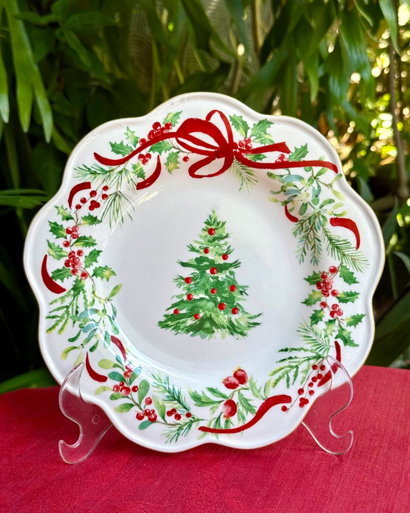 Prato de sobremesa em cerâmica com borda ondulada, estampa de frutinhas vermelhas com laço nas borda e árvore de natal no centro.