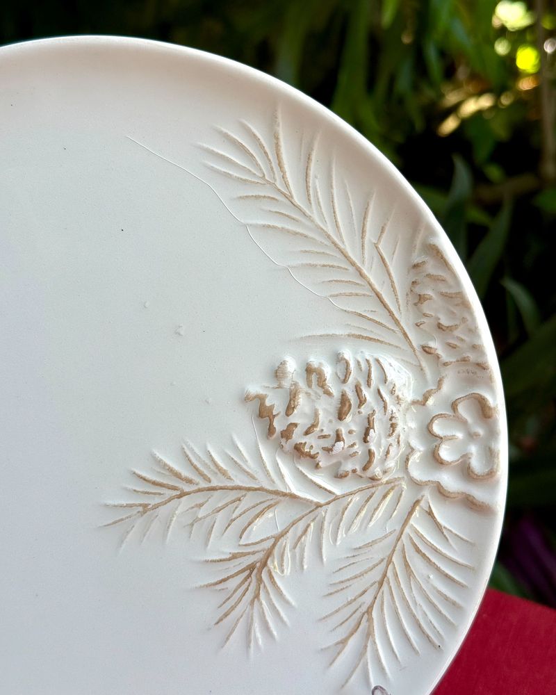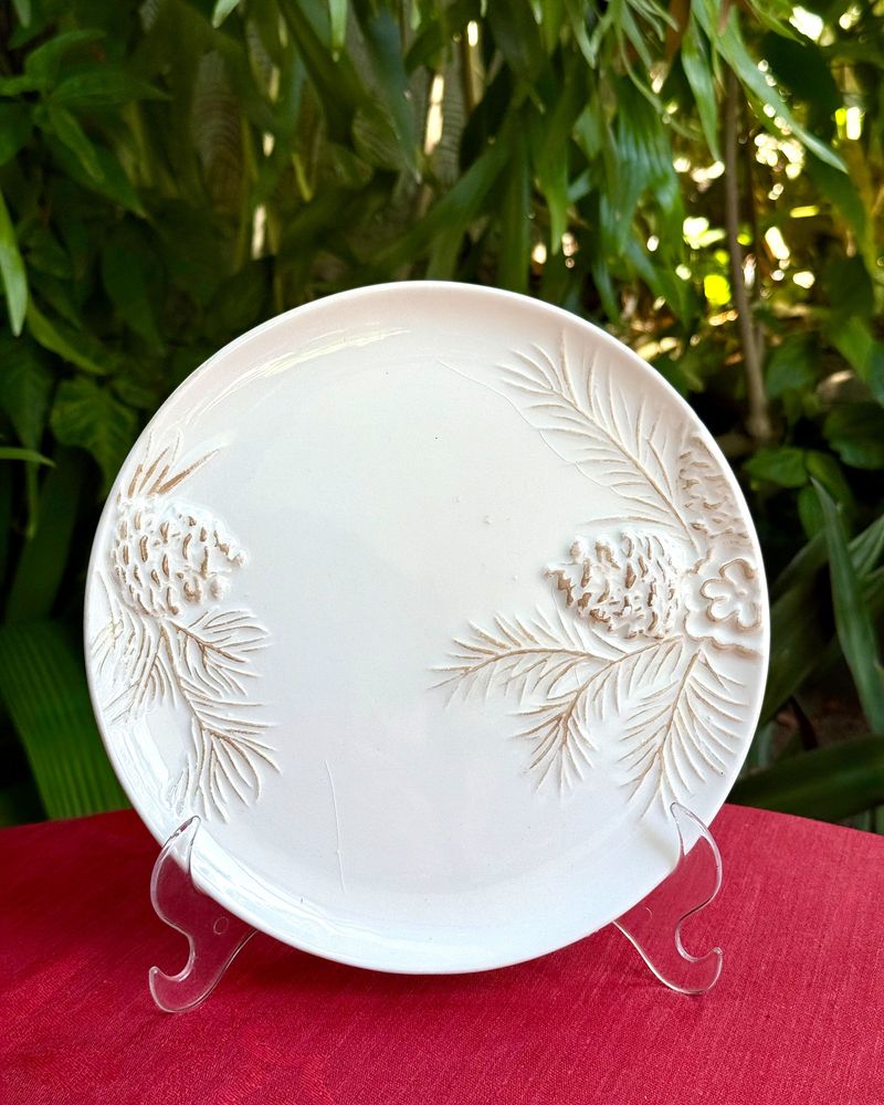 Prato de sobremesa em cerâmica branca com pinhas em relevo.