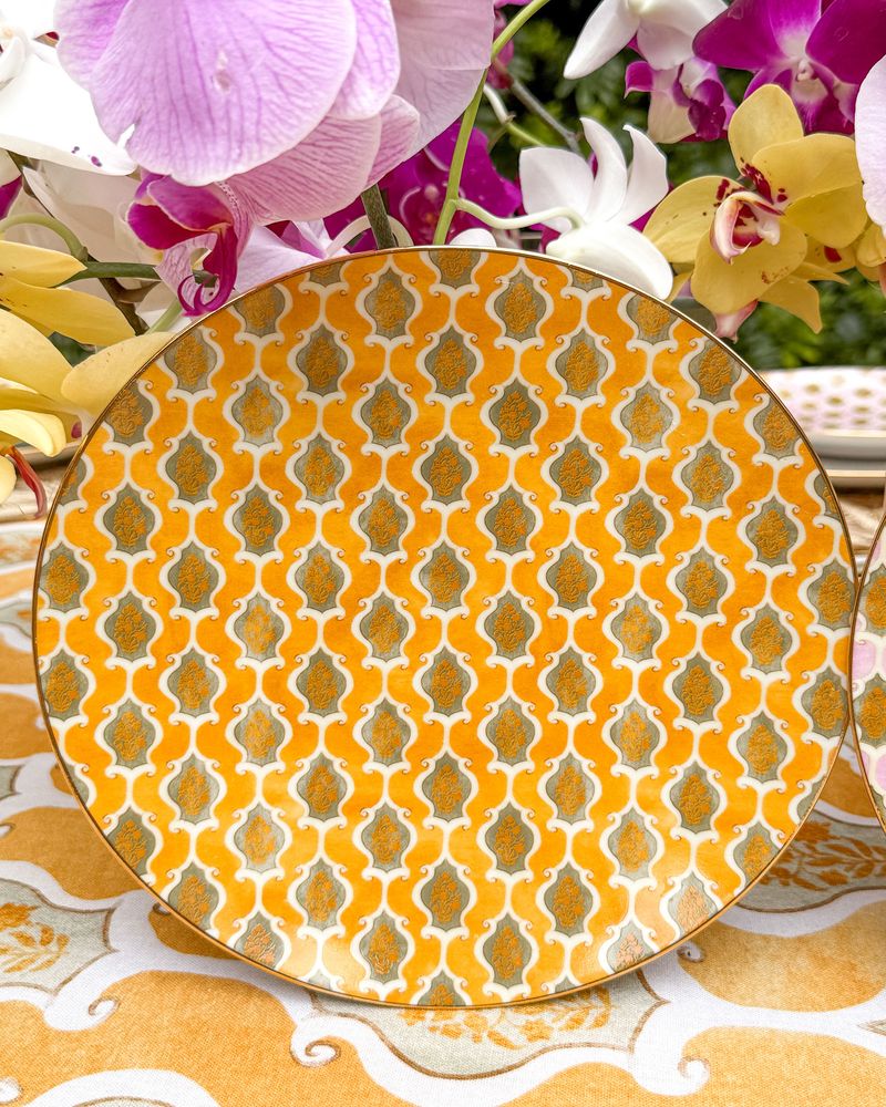 Set com 2 pratos de sobremesa em porcelana, com delicado friso dourado feito à mão