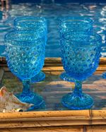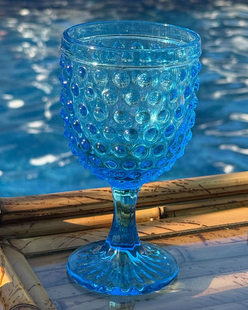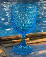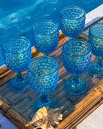 Taça de vidro pé baixo bolinhas azul turquesa.