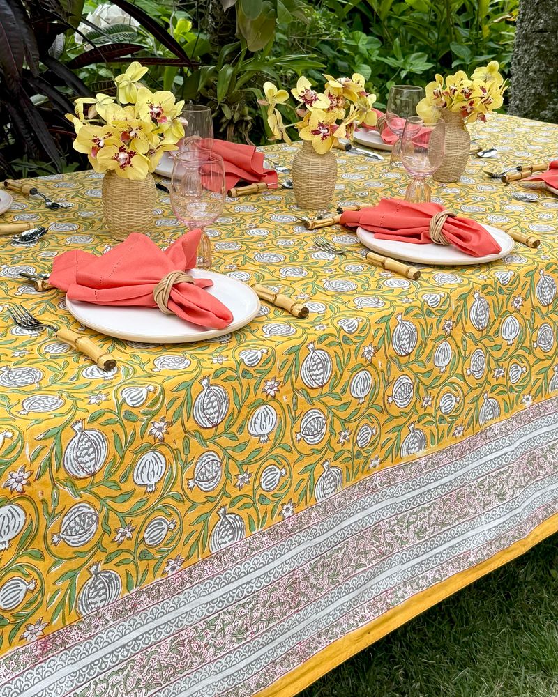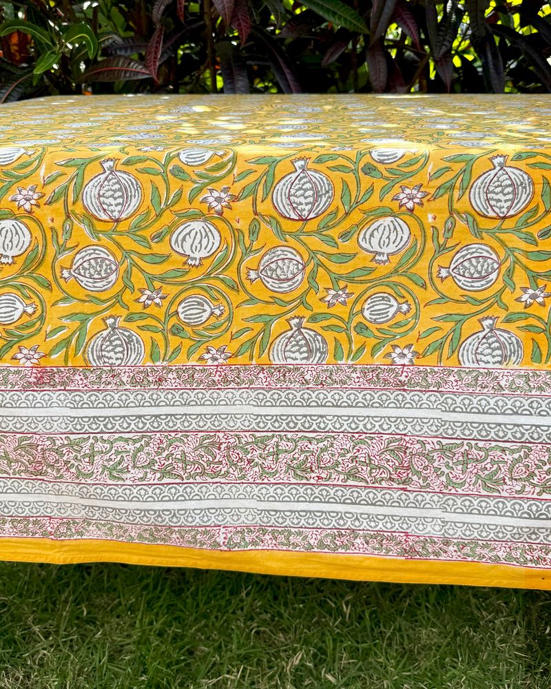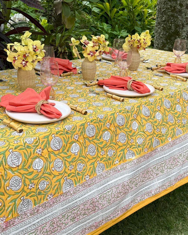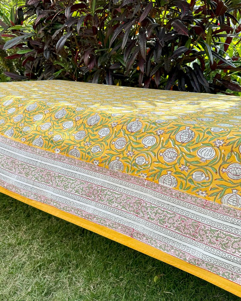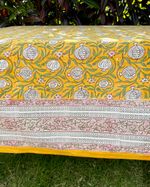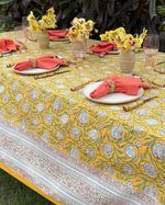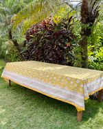 Toalha de mesa quadrada tecido de algodão estampa block print indiano na cor amarela medindo 2,50x2,50m.