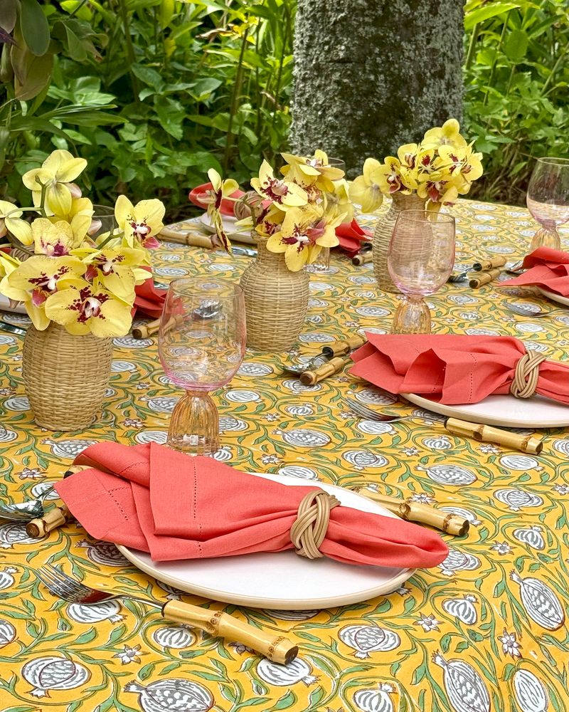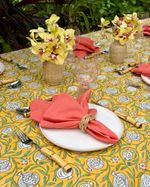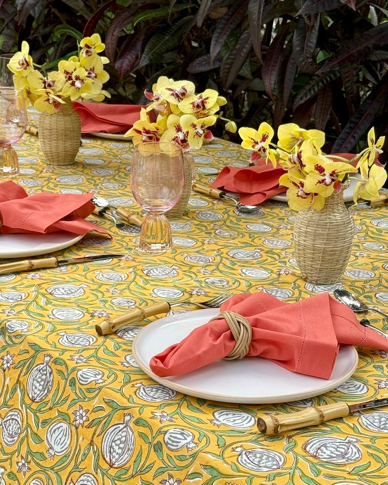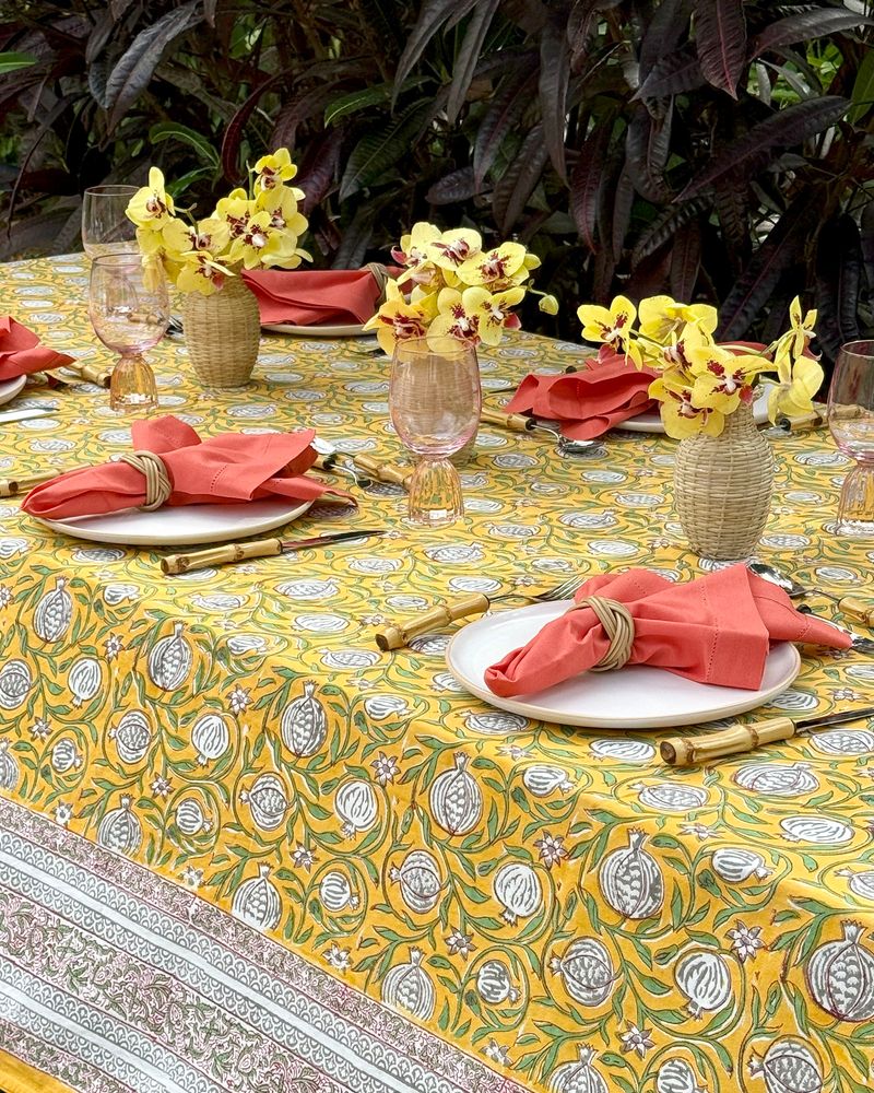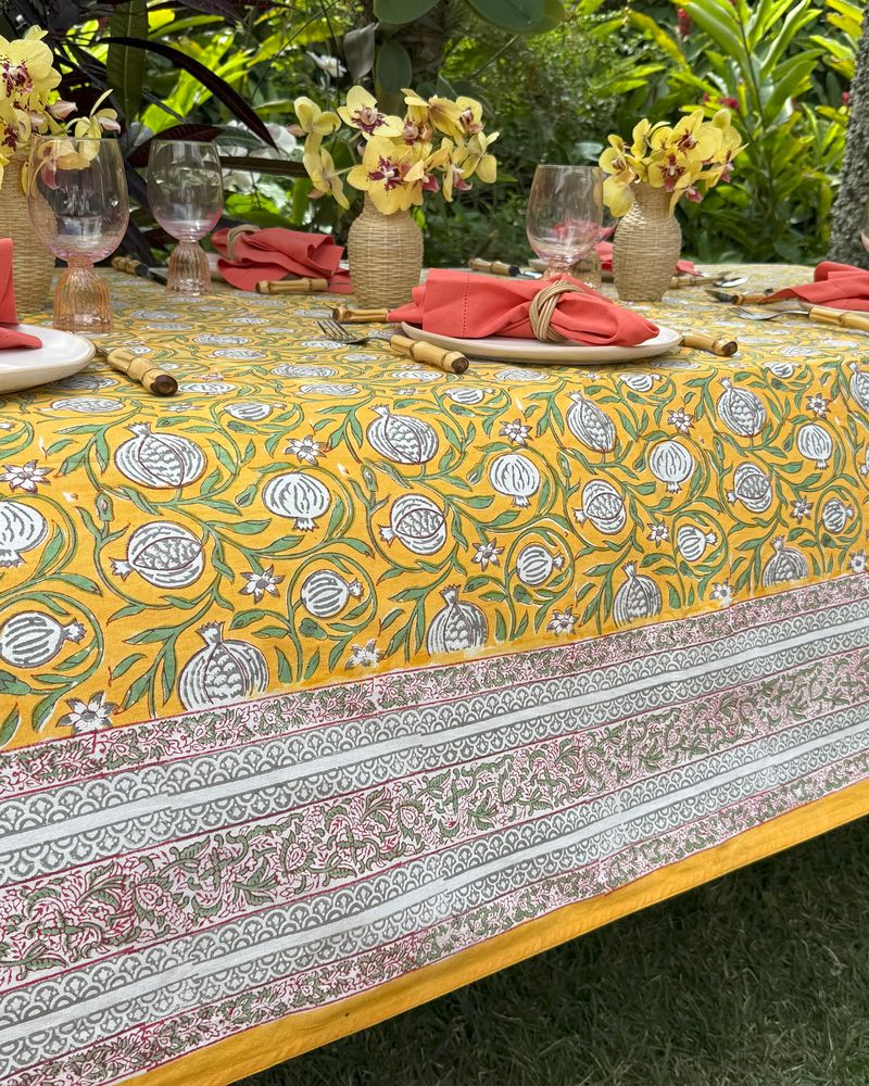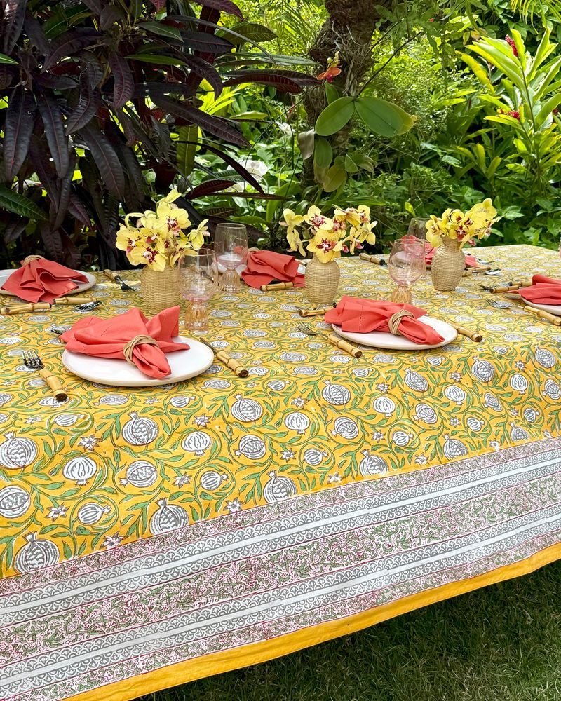 Toalha de mesa quadrada tecido de algodão estampa block print indiano na cor amarela medindo 2,50x2,50m.