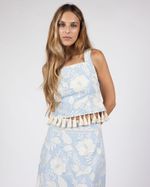 TOP RETO COM TECIDO BORDADO FLORAL AZUL E BRANCO, APLIÇÃO DE FRANJAS NA SUA BARRA, COM ALÇAS LARGAS TRAZ CONFORTO E ELEGÂNCIA.