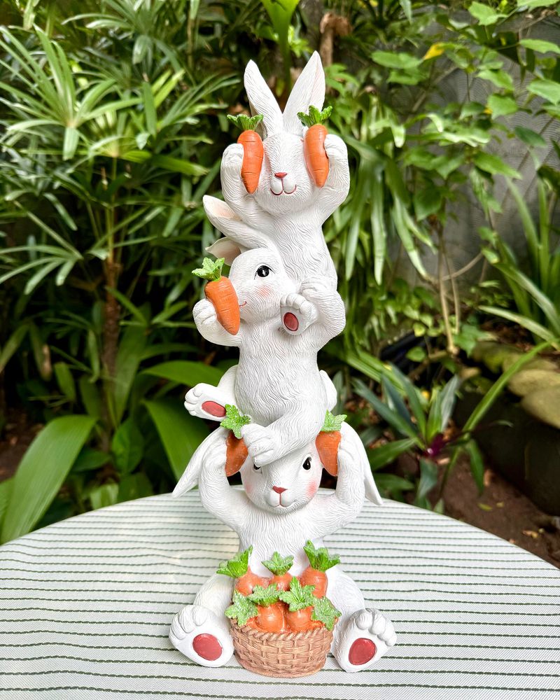 Torre de coelhos em resina com cenouras medindo 42cm de altura