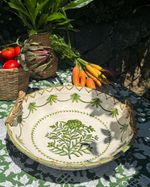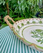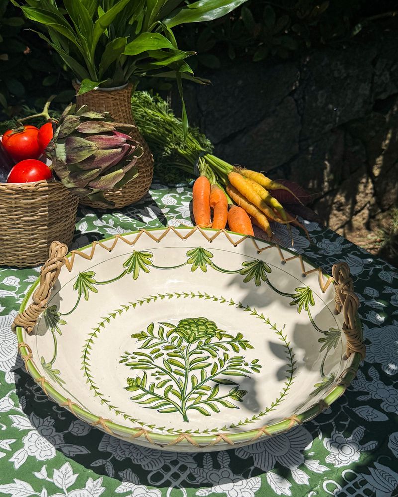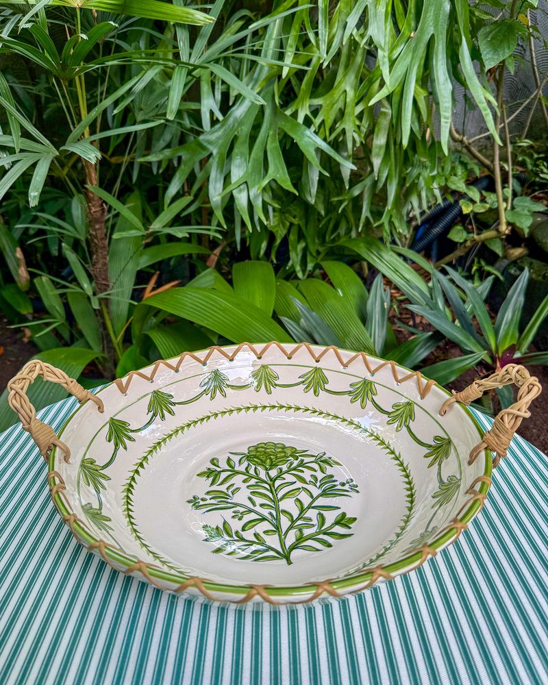 Travessa em ceramica redonda pintada a mão com alça de junco medindo 35cm de diâmetro.