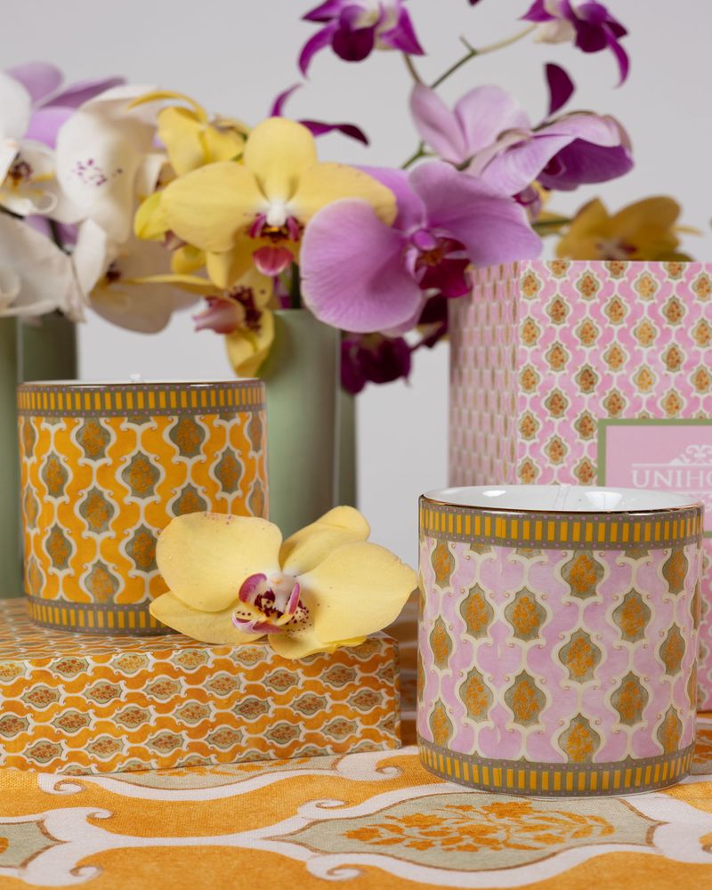 Vela em porcelana aromática de chá branco cor rosa com friso dourado.