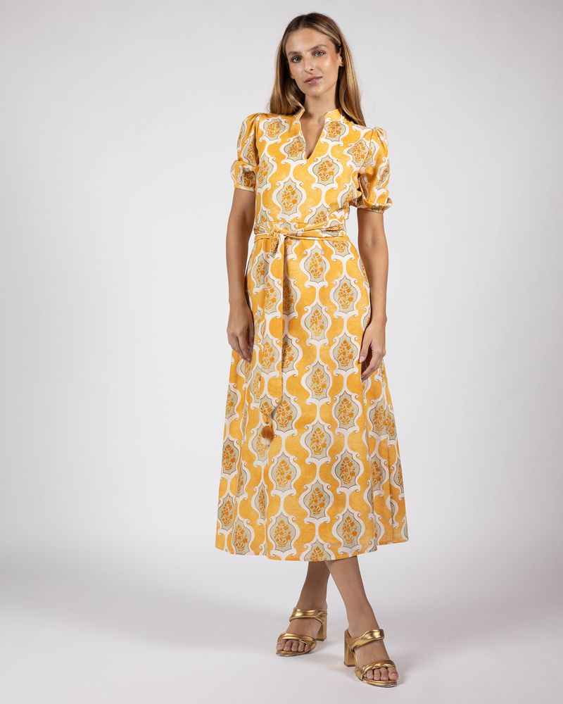 VESTIDO ESTAMPADO DE ARABESCO OCRE COM BABADO NA MANGA, ACINTURADO, COM SAIA RODADA E PONTO PALITO TINGIDO AO LONGO DA SAIA E FRANJAS EM SUA BARRA. UMA PEÇA LEVE, ELEGANTE E PERFEITA PARA ILUMINAR OS SEUS DIAS COM SOFISTICAÇÃO NATURAL.