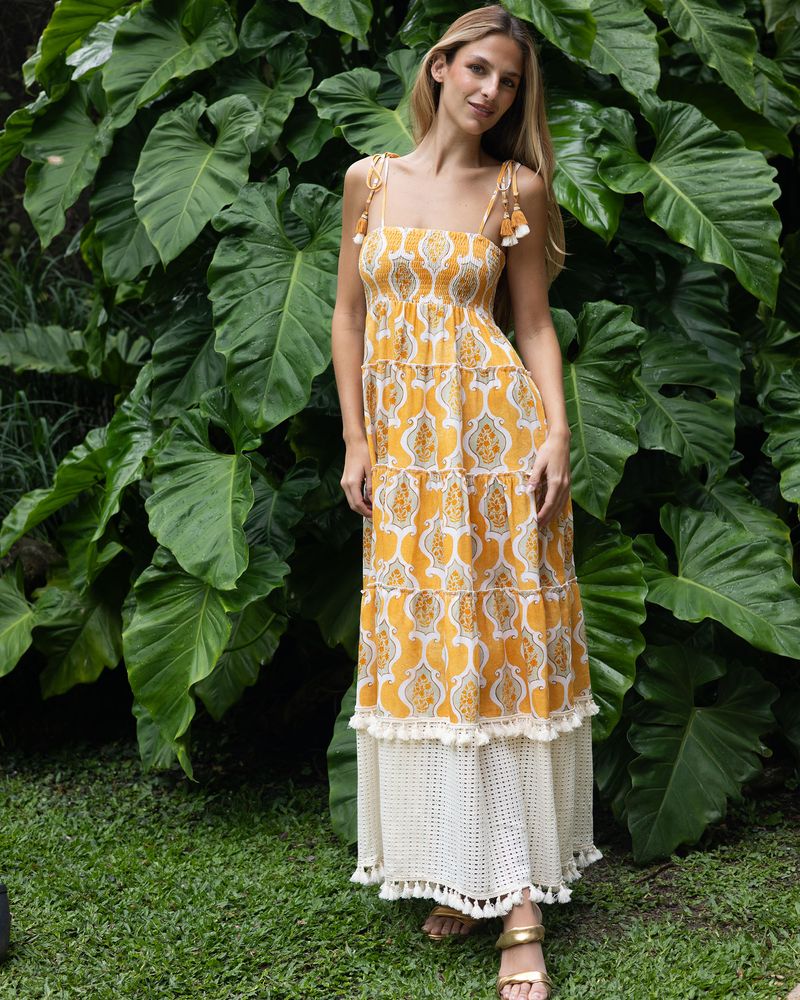 VESTIDO LONGO COM ESTAMPA ARABESCO, LASTEX E TASSELS PENDURADOS QUE TRAZEM UM CHARME ARTESANAL ÚNICO. POSSUI BARRA TEXTURIZADA COM ACABAMENTO DE FRANJAS BORDADAS MANUALMENTE, RESULTANDO EM UMA PEÇA LEVE, ELEGANTE E CHEIA DE PERSONALIDADE.