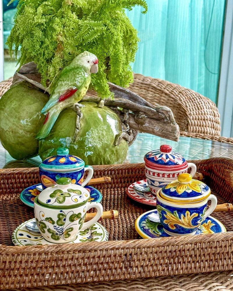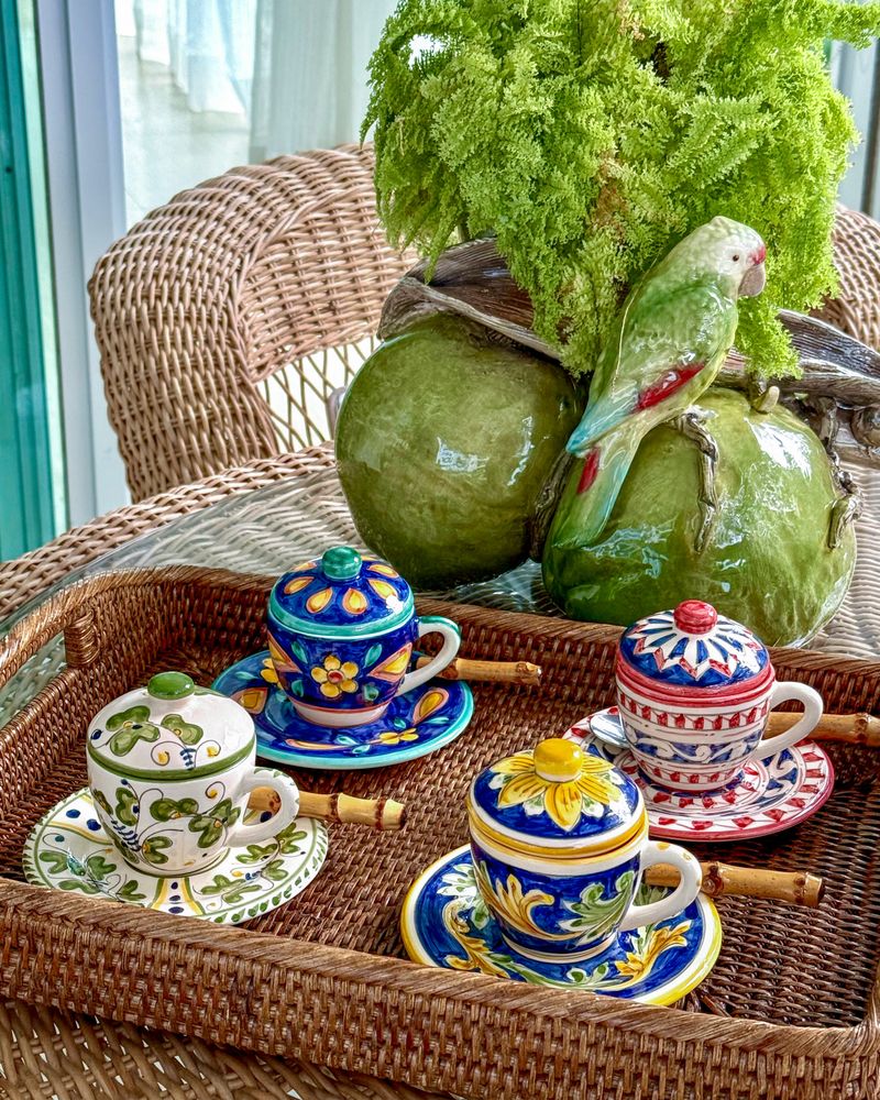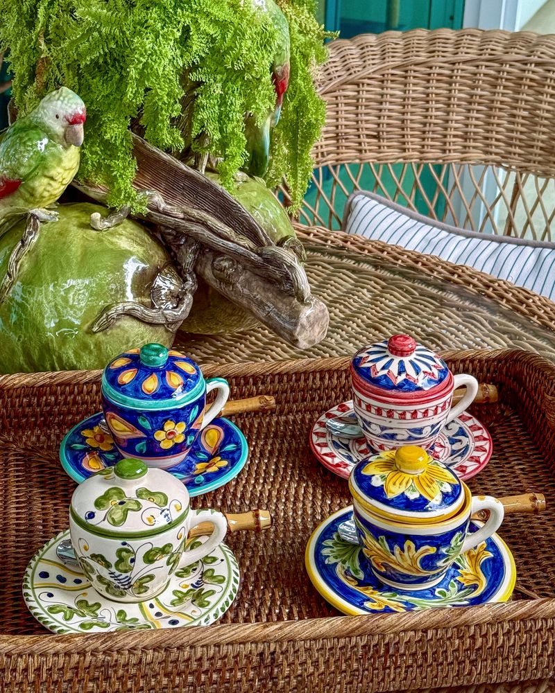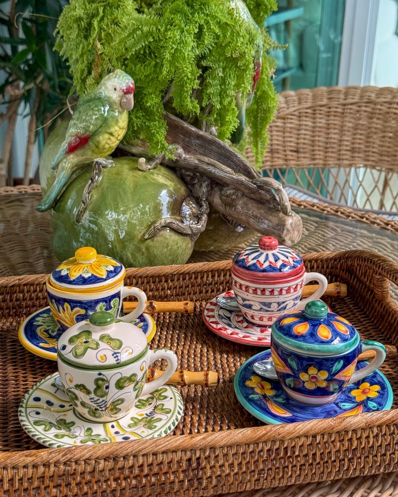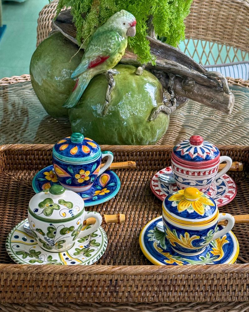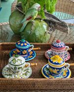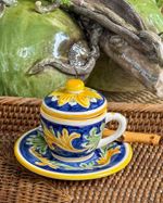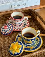 Xícara de café pintada a mão exclusiva unihome em cerâmica com tampa e pires.